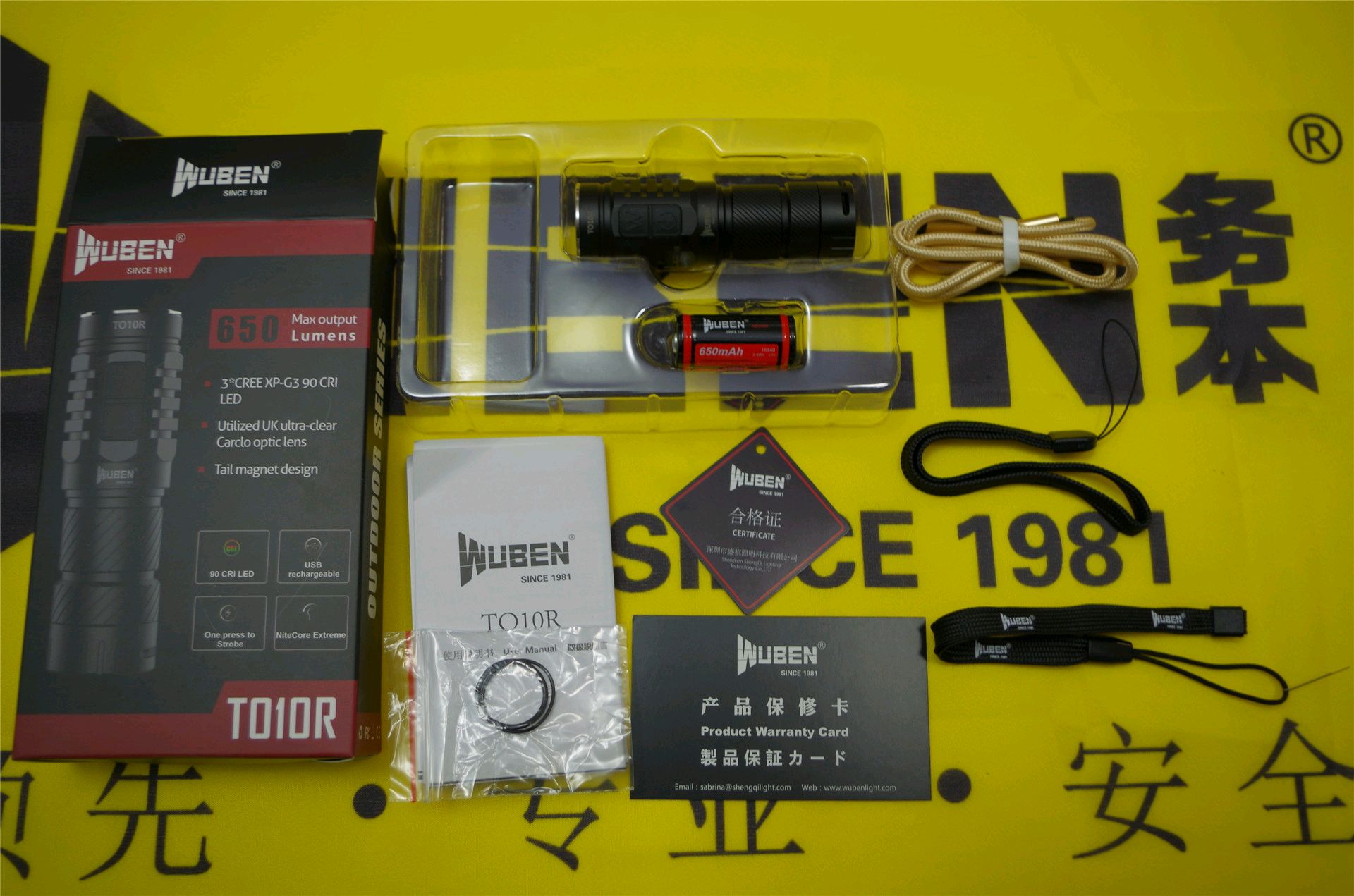包装内标配的有手电、650mAh 16340锂电池、金色MicroUSB充电线、说明书、合格证、保修卡、两只备用O圈、两条不同规格的尾绳。