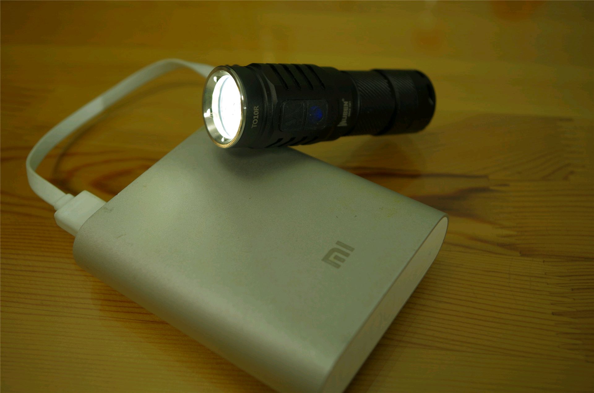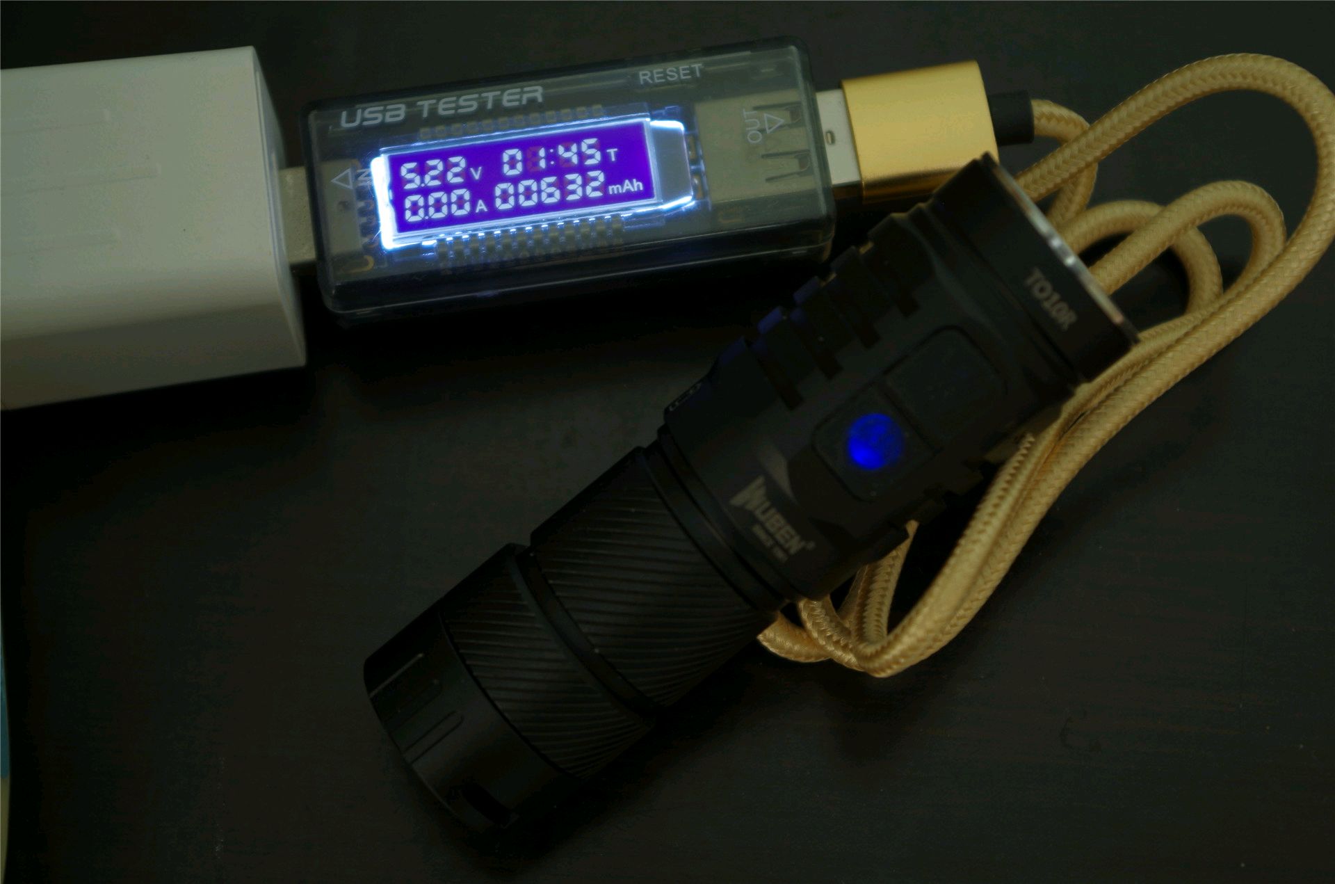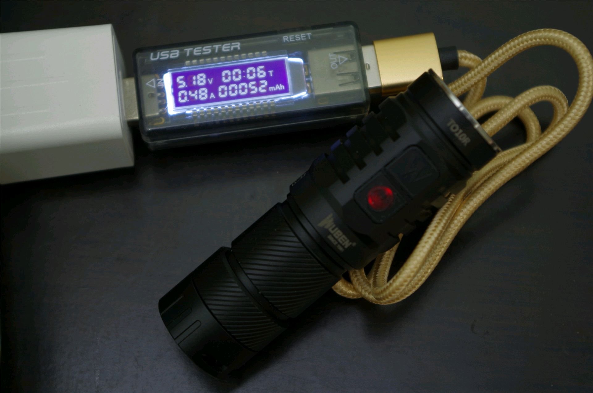 TO10R内置了MicroUSB充电接口,说明书中给据的充电参数指标为5V1A,通过充电测试发现正常情况下充电电流为0.5A左右,估计说明书数据有误,因为想想650mAh的16340锂电池一般也不会有那么大的充电电流。电池充满时间大概为1小时45分钟左右,同时具备边充边用的功能。