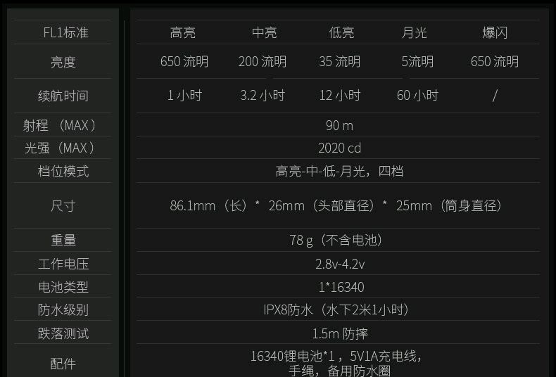 4、手电锁定手电在关闭状态下,同时按住两个按键1秒,前灯长亮一下,表示手电锁定,按键处于无效状态。同时按住两个按键1秒,手电低亮,表示按键锁定解除。松开按键后低亮关闭。