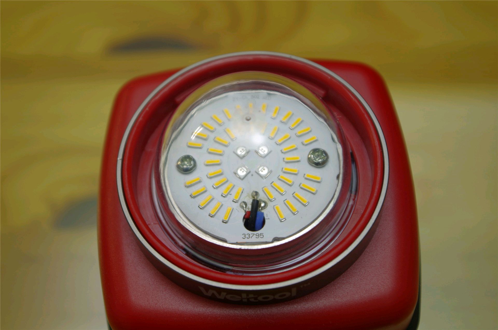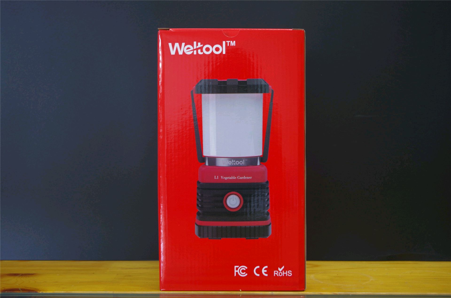 手提灯在充气缓冲塑料袋中包裹的非常紧密,所以从袋中取出时要稍微费点力,当然你要是不在意把充气袋损坏的话就简单多了。L1菜园子采用了非常经典的稳重而又大气的红黑色搭配,白色灯罩采用了半透明聚碳酸酯材料,灯罩下方在一圈金属灰色正中则是卫途的英文字母商标WELTOOL,灯体表面及头部、底座都采用大面积包胶处理,手感非常好,质感满满。由此保证了在湿滑或不平的表面上平稳放置,并且耐撞击。下方黑色包胶中间一颗白色内凹式电源开关按键镶嵌其中。