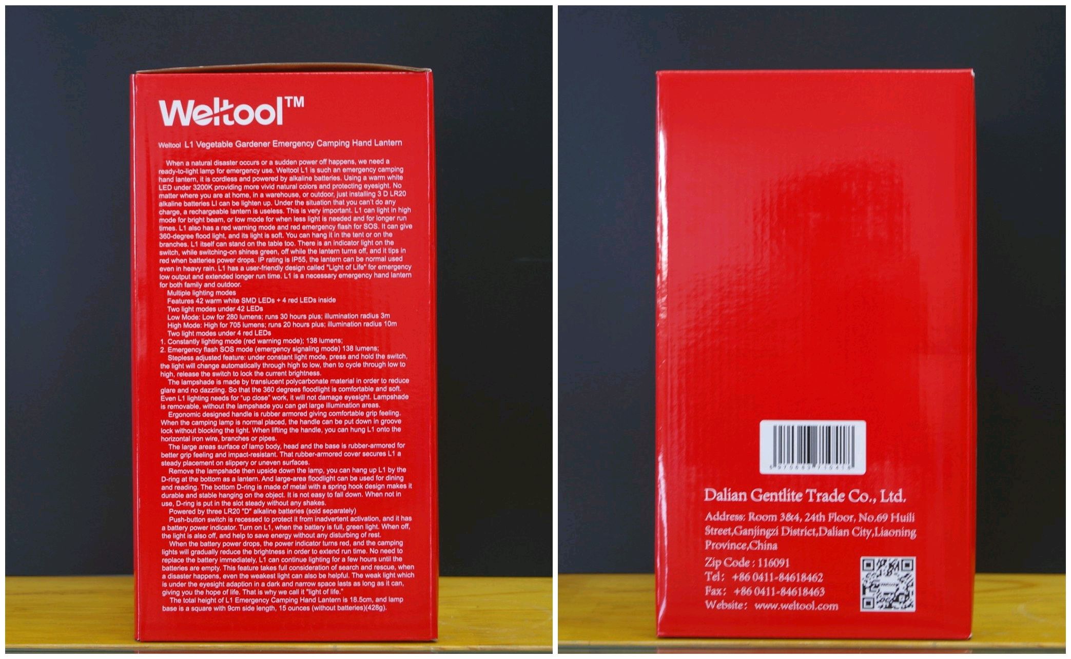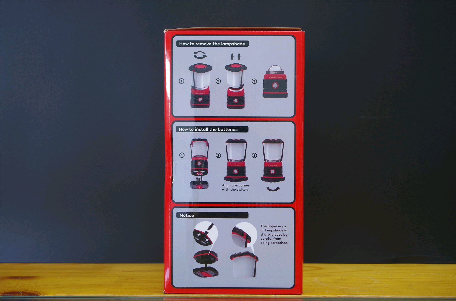 先看这非常显眼靓丽的大红包装盒,典型的中国红很是吸引眼球。包装盒正面印制了手提灯图片,侧面是英文介绍、拆解安装电池等使用方法以及产品标识二维码等信息,简约、规整。