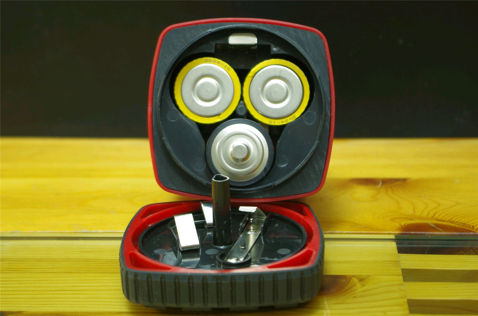 手提灯的电池仓位于底部的大面积包胶部位,通过旋转底部电池仓盖,打开电池仓,里面串联安放三节D型电池即以前老国货虎头牌手电上使用的一号电池。电池仓中间设计一支可旋转的横截面呈水滴型连接导引柱,通过电池仓盖上的对应槽来定位安装,设计比较新颖。
