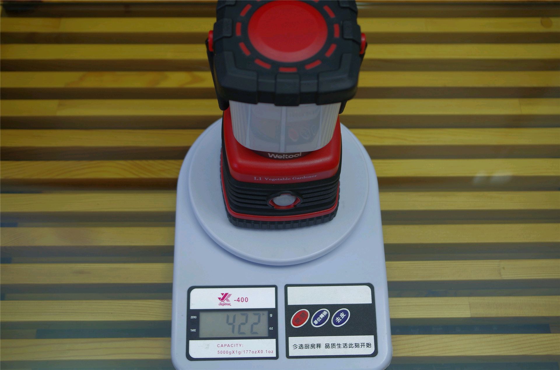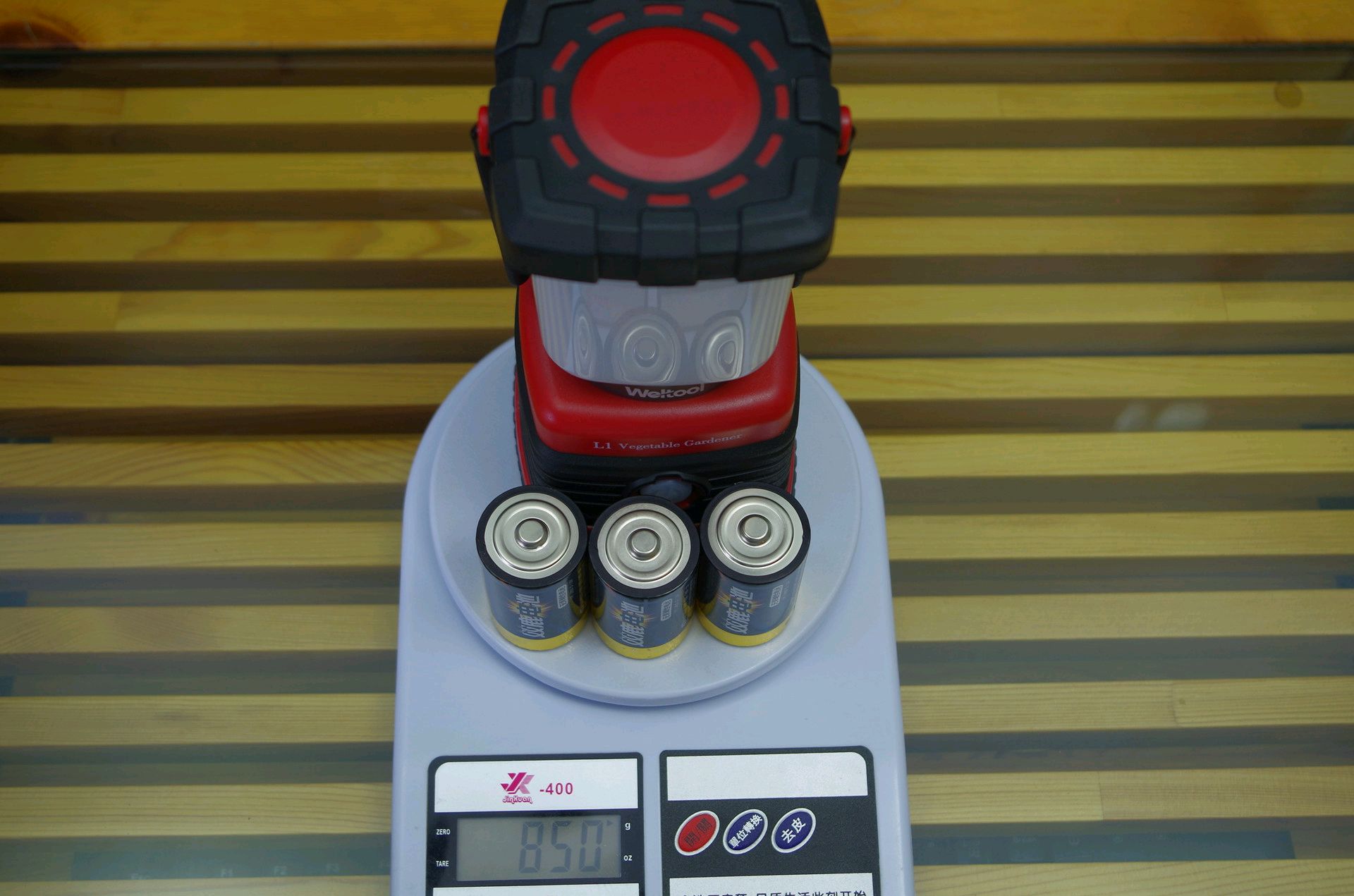 L1菜园子整灯重量为422克,这个重量对于广大手电桐油来说算是重量级的了,可是作为一款应急露营灯来说,并不多显沉重,并且此灯使用三节D型电池,自然不会太过轻盈。测试中使用了三节双鹿D型碱性电池时总重达到850克。