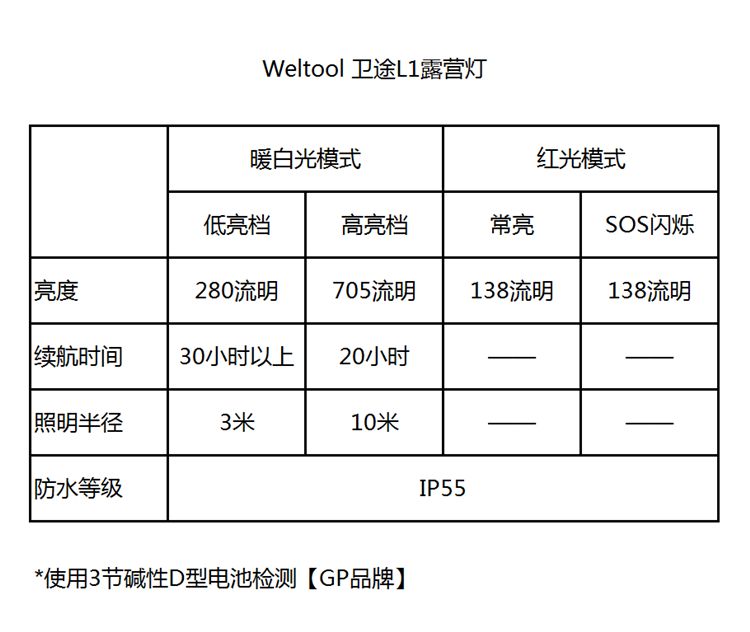 从以上可以看出卫途L1菜园子应急露营手提灯功能性方面已经是非常出色了,而此灯除了在颜值、功能方面吸引我之外,更让我叹服与他的强大的续航性能。厂家给出的在使用GP品牌D型碱性电池时可以放射出700流明的光通量,而对应的续航时间也达到20多个时。