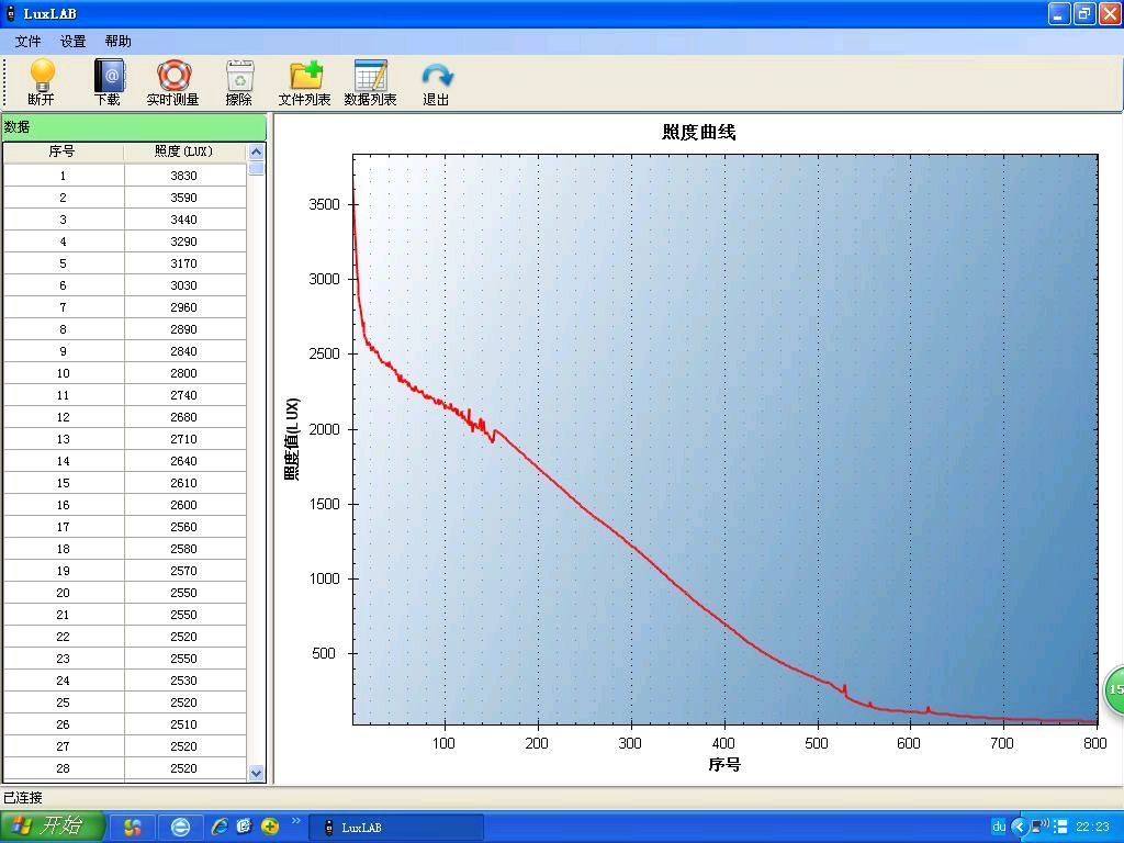 作为对续航能力一项非常看中的我来说,当然也要亲自测试一番。使用3节全新双鹿D型碱性电池,使用自动记录功能的照度计在室温17摄氏度的环境下靠近灯罩附近每一分钟记录一次照度值。