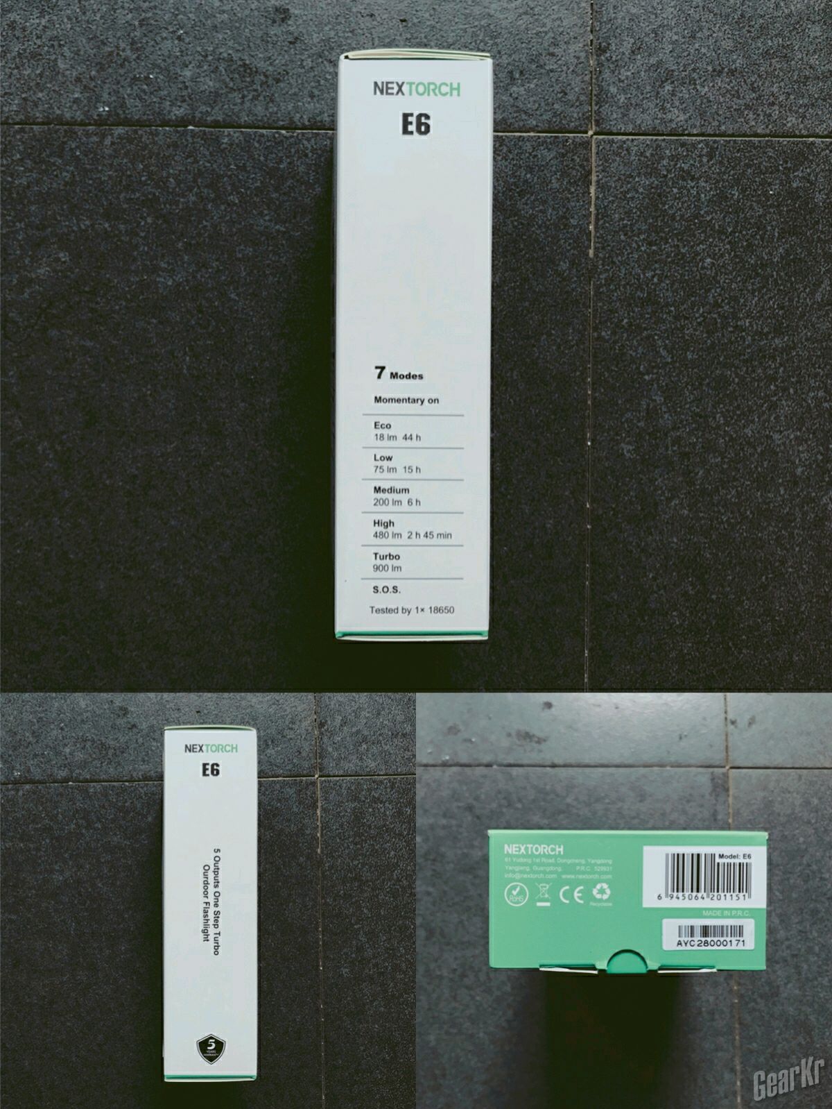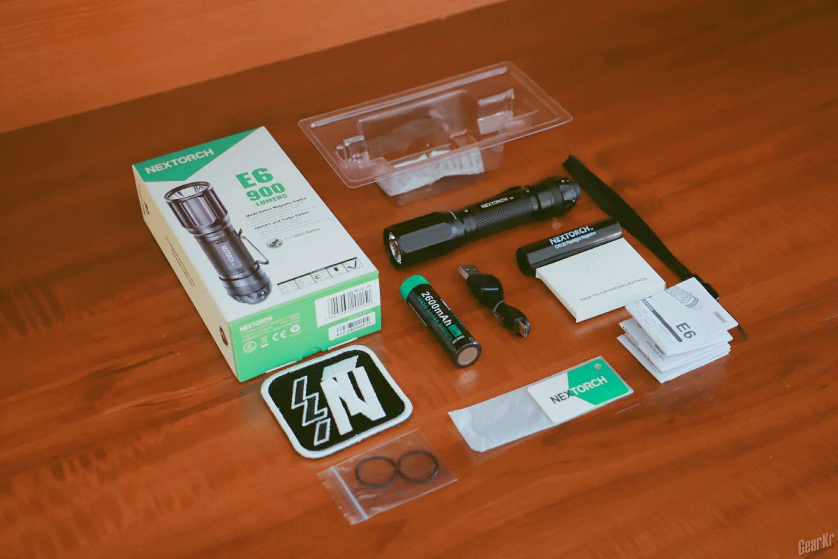 开箱:E6筒身x1、18650充电锂电池x1、USB线x1、CR123电池套x1、手绳x1、说明书及包装盒各x1、备用O圈x2、产品注册卡x1、纳丽德logo魔术贴x1(不在包装内)。