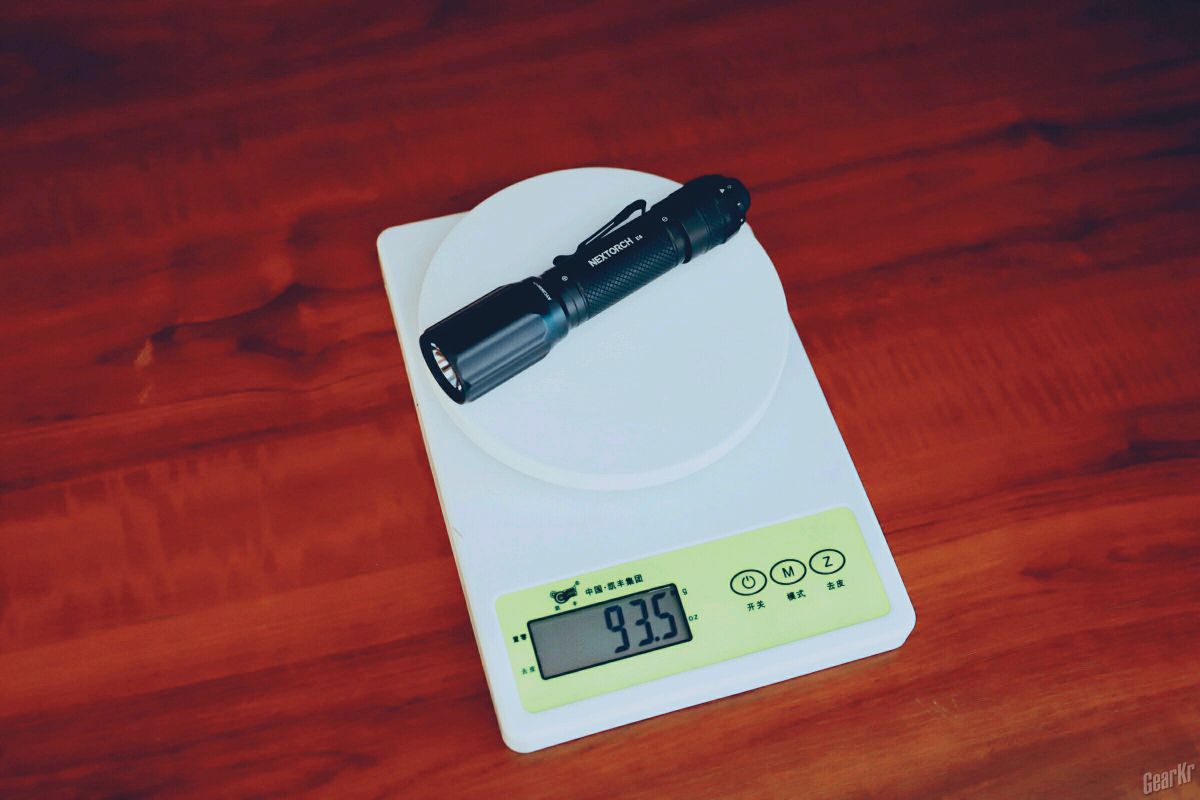 空筒重量93.5g。纳丽德某宝在售的18650电筒中除TA30、E51之外基本都超过了100g(对比官方数据),所以E6可以说“羽”的名副其实。