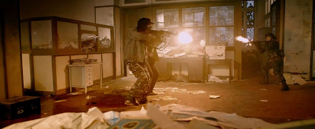 然而黑武警这事儿还没完,比如后面的巷战这场戏中,大家可以看到两名武警竟然站在所谓“死亡漏斗”的门口区域进行还击,光线非常清晰并且完整的勾勒出了两名武警战士的轮廓。而对比在掩体后的反政府武装这其中的高下立现,可能这也是导演为了体现经过军事训练的专业士兵与常年进行实战的业余战士,在真正进行实战中的战术水平的差异吧,毕竟实战才是最好的战术老师。