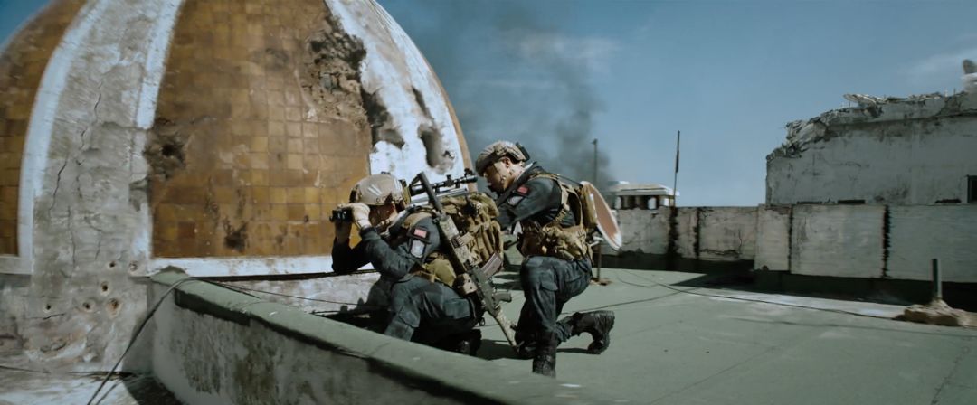 再比如楼顶这对狙击新人的亮相之战,可能在没有真正经过狙击训练的人看来很棒棒,但是在我眼里看来细节还是问题很多的。首先,这个相互依托的姿势是狙击双人配合的基础姿势,但在狙击射击中最重要的是稳定性,所以前面的观察手必然会以最稳定的姿势来当这个“枪架”,因此一般这个组合动作观察手都会以坐姿,让持镜的双手都能通过大腿进行依托,而不是蹲姿只靠一只手来依托,这样在持久的观察中很容易因为右手无依托而晃动,而“枪架”的轻微晃动都会直接影响狙击枪的晃动从而影响远距离射击的精确性。