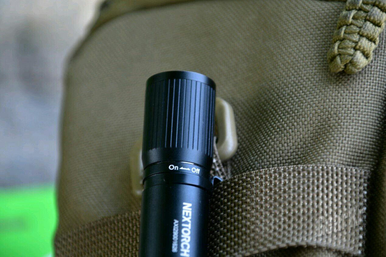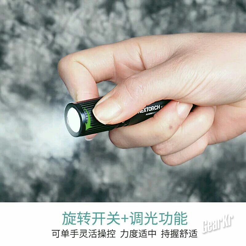 手电头部的设计师采用细线条状设计,其作用有散热和增加开关手电的阻力,从图片可以明确看到开关的提示