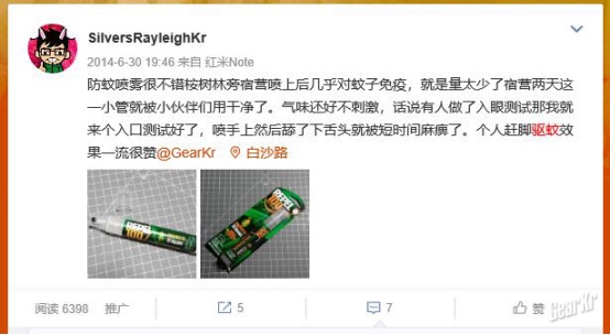 \n后来慢慢的入门了,对各种装备有了一定的认识,也开始写写测评。记得第一次写GearKr的东西是一支驱蚊水,那时候没像现在要求这么多,就发个微博说说使用感受。与其说是测评不如说是试用。但也是挺用心的,用生命在测试。 </p >