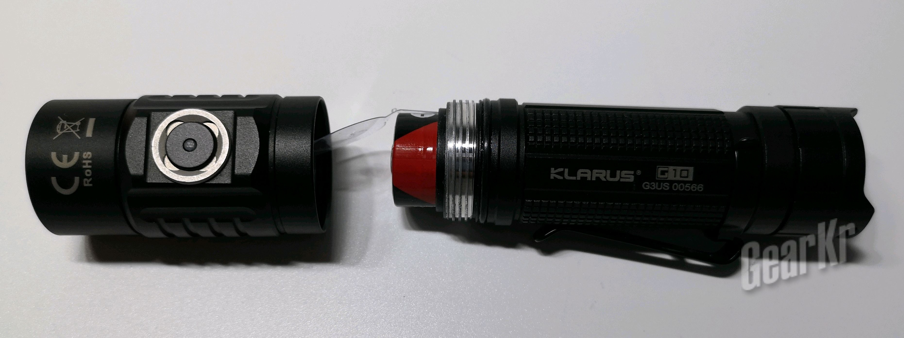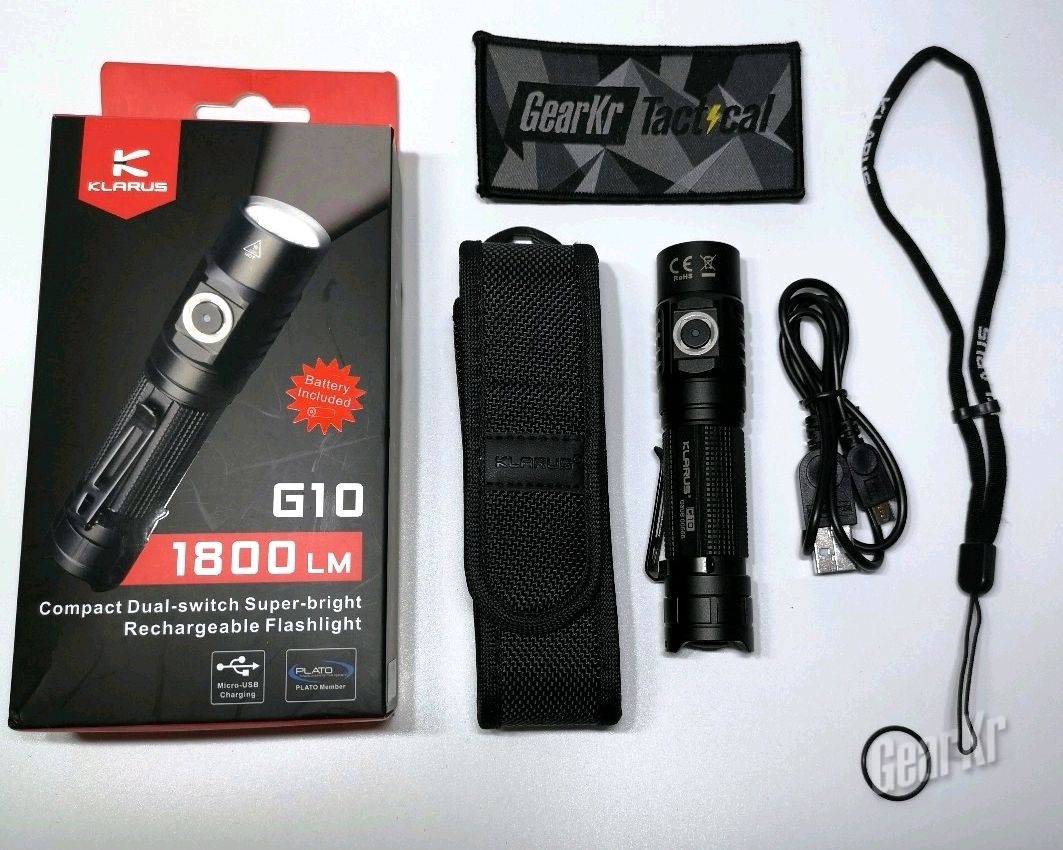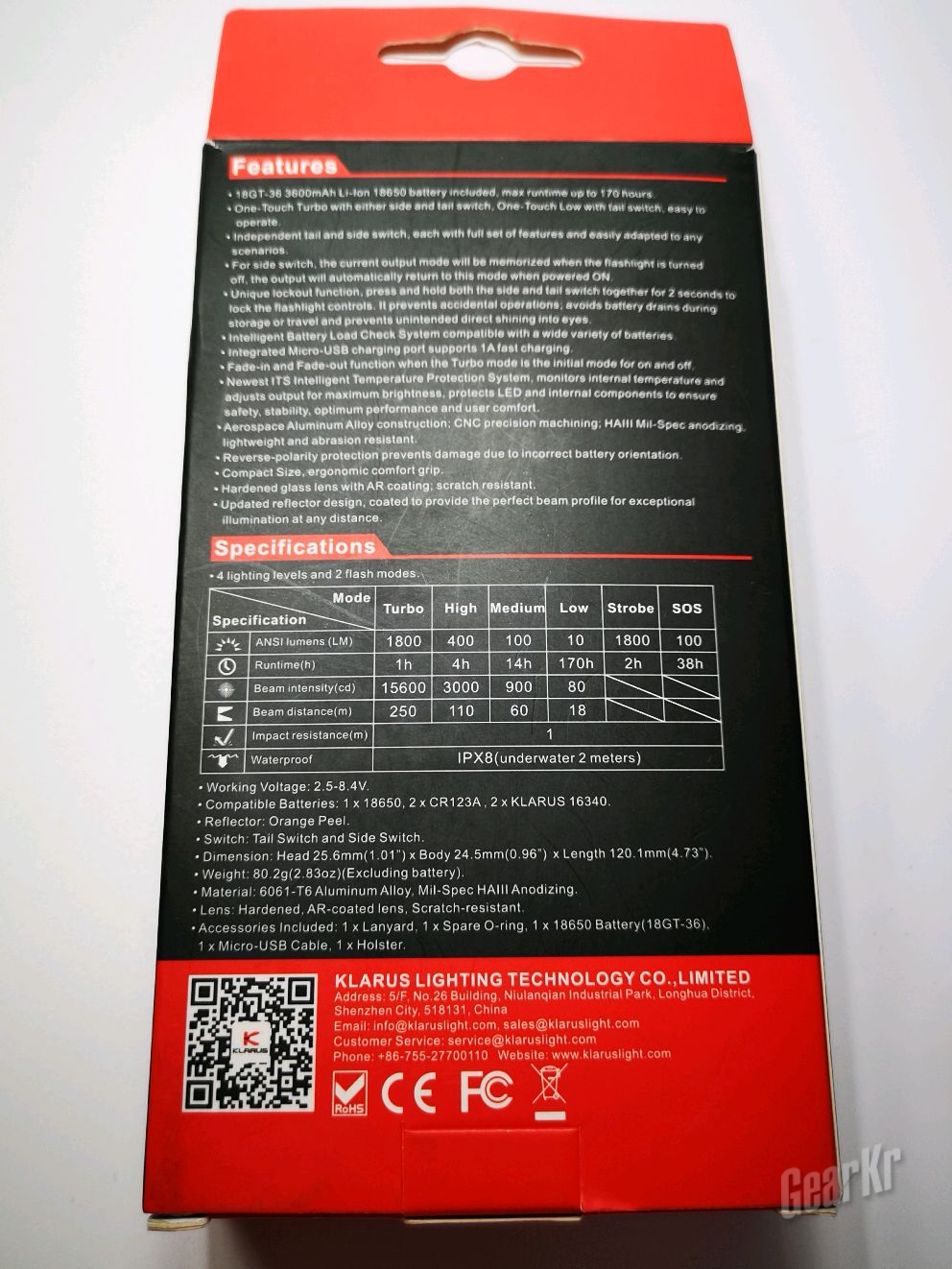 KLARUS凯瑞兹,源自古拉丁语CLARUS,中文译为“清晰的,明亮的”,象征光明之意。其旗下共分XT、R、G、F、ST、BK、FL、MI、P、SD十个系列,拿到手的这款G10是G系列里面的小弟。外包装仍然采用黑红两色系的长方纸盒,正面用1:1的比例UV了一只G10手电,显得很直观,左上角是凯瑞兹的英文logo,外包装盒上基本没有中文说明,满满的国际范儿????