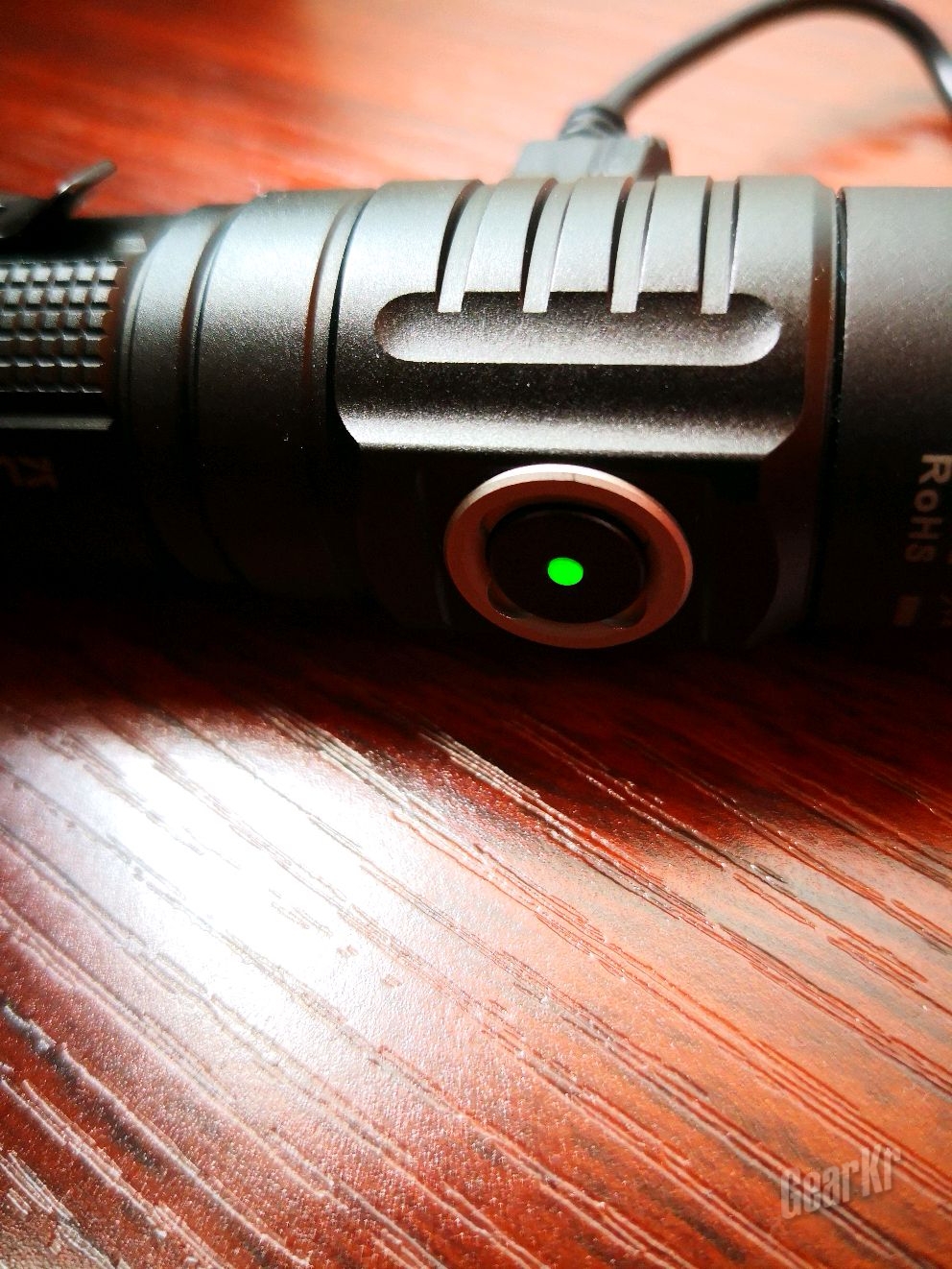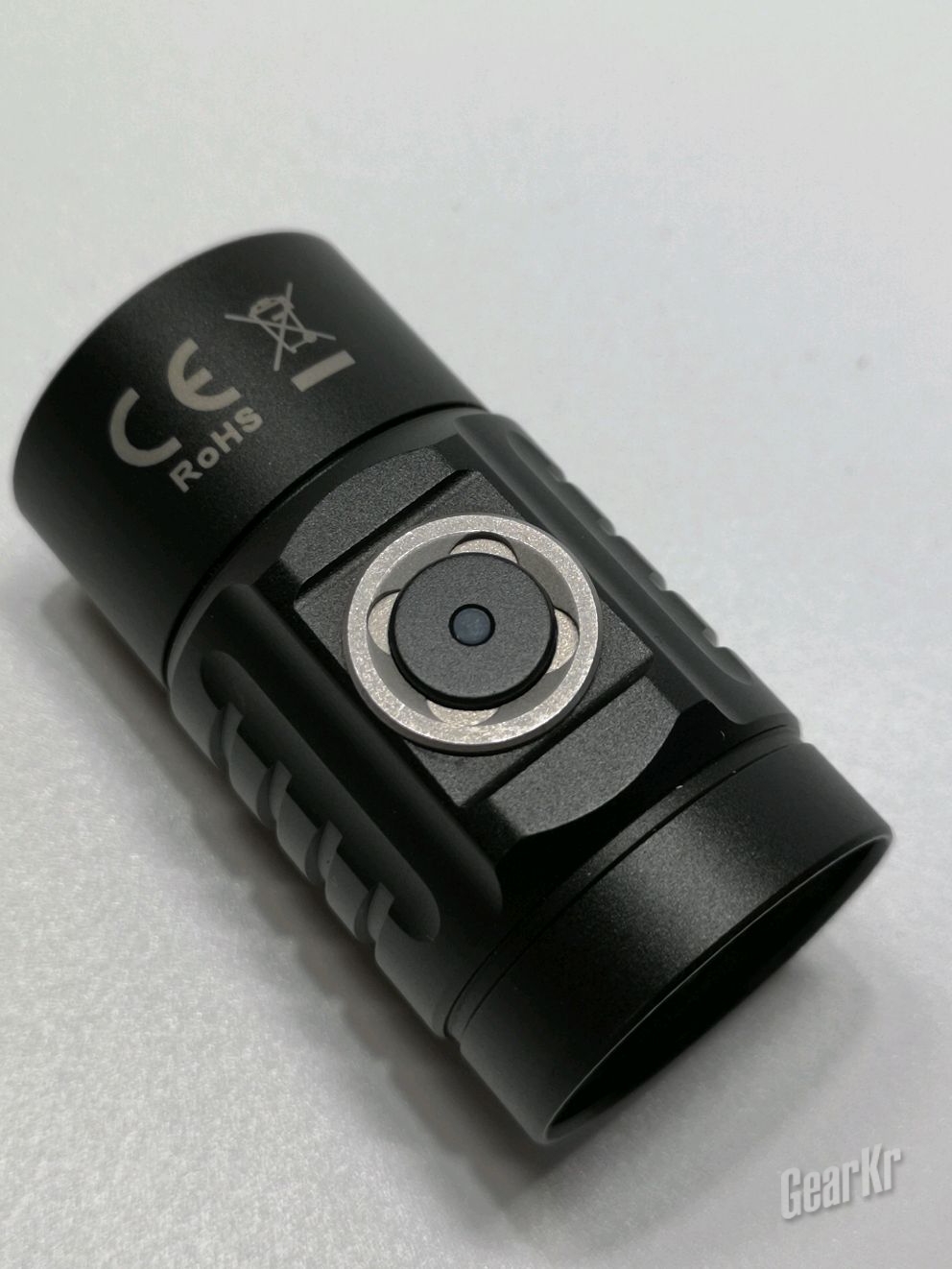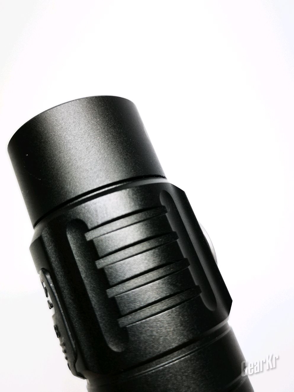 筒头处的按键设置在一个矩形平台内,黑色圆形触片,中间的小孔为电量显示灯,周围是金属石洗的保护圈,既可以方便戴手套时找到按键,又可以防止放在包内被误触开关,细节体现了产品设计的人性化!????筒头上还有提示防烫的图案,两侧是简单的散热鳍!