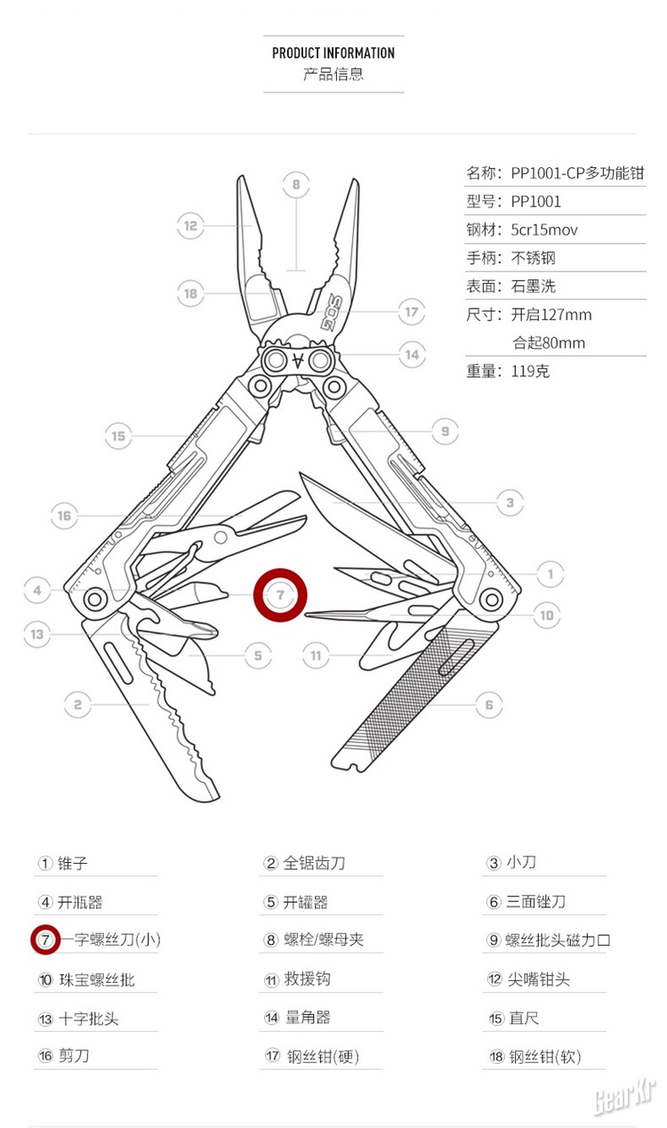 在这里要吐槽一下,在SOG中国官网上,截至写测评的时候(2018.11.17pm10:19)还搜索不到PP1001-CP的产品信息,在网上找到的产品功能分解图主要有两个版本,这个序数的排列顺序反人类的混乱先放在其次,其中一个版本竟然怎么都找不到序数字⑦,另一个版本的序数字⑦把开瓶器重复显示成了一字螺丝刀……也是醉人,不知道这是什么原因……相比产品包装背面的分解图,序数字排列的清晰明了,除了是英文以外,完美……