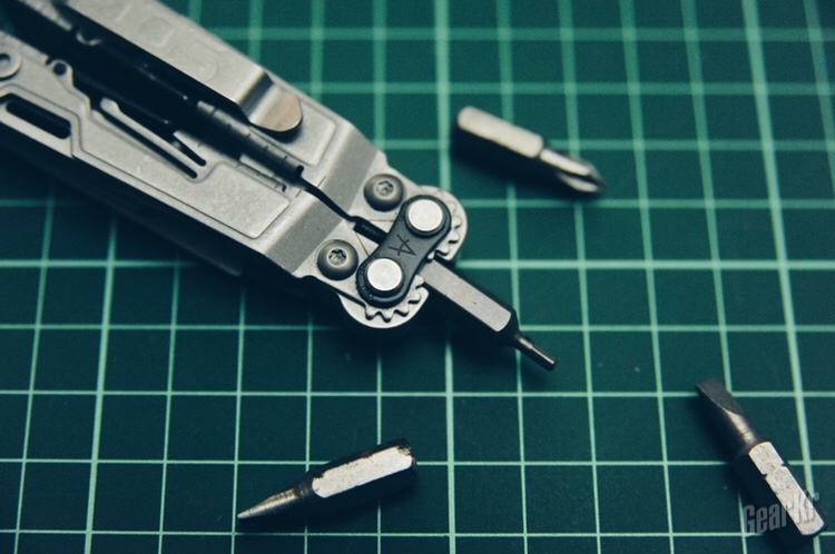 最后两个工具比较隐蔽,一个是压线钳,只有在完全打开钳子的时候才能使用;另一个批头磁力口工具恰恰相反,需要完全闭合收起钳子,匹配所需规格的螺丝批头使用。我试了试市面上通用的替换批头,基本都可以使用,里面磁力的设计相当实用,避免了批头掉到各种缝隙里的情况发生。