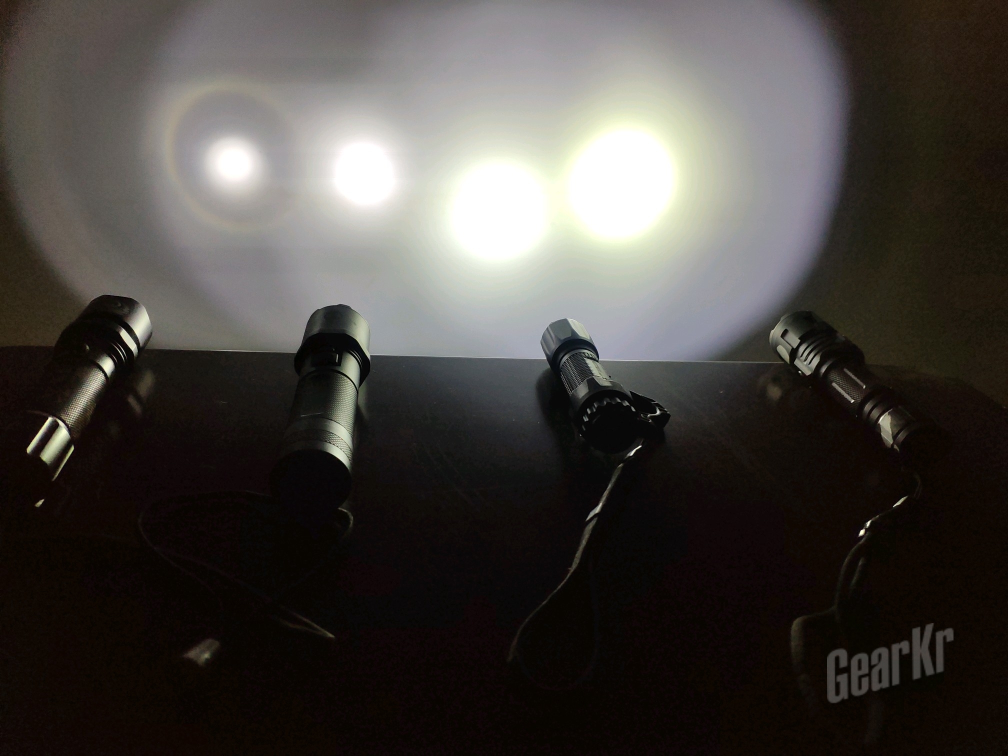 城市迷彩与几种手电的比较。城市迷彩比其他三款要宽,长度居中。
