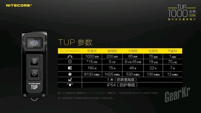 TUP使用的是CREE XP-L HD V6 LED灯珠,能提供从1流明、15流明、65流明、200流明的四个常用档位,和1000流明的极亮档照明。内置一颗1200mAH锂电池,在我常用65流明中亮档情况下,能提供差不多10小时的连续照明时间,足以应对日常需求。