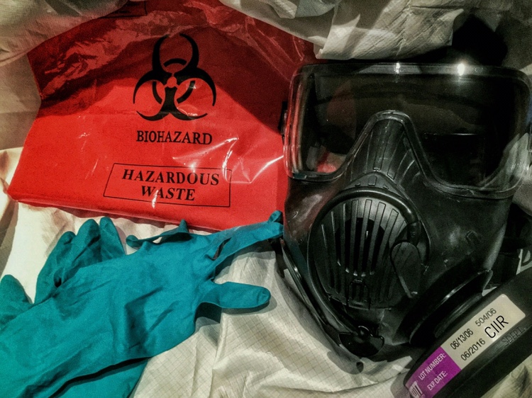 接下来就是比较大只的东西了,我的意思是防护服。市面上有许多防护服都能有效防护这些微生物,实际上在许多伊波拉病毒泛滥的一线疫区,黄色的雷克兰防护服就足够了。而且它还很便宜,真的,你不一定需要那套奇丑无比的雷卡防护服。别忘了在防护服外加一件塑料围裙,我知道你可能认为围裙是家庭主妇才会需要的东西,但实际上一件附加的塑料围裙就能大大提高防护服的安全系数,如果不小心被感染者喷了一身血,你会很庆幸自己穿了这东西的。剩下的就是那些虽然没那么重要,但也缺一不可的东西,比如包裹住鞋子的塑料鞋套什么的。但有一样东西你可能不太需要,那就是管道胶带。是的,管道胶带在生物防护中很常用,但我严重不建议你将它缠绕在手腕或脚腕上,许多防护服都没有足够的耐久度来抵抗胶带的摧残,你会将它撕坏的,听我的用紧口手套来保护自己吧。