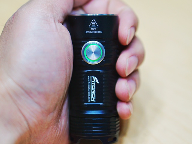 下来就是单按一下就会打开,连续按压这个按钮3次,手电会显示现在的剩余电量,绿色的灯代表1V,红色的代表0.1V有多少就闪多少下,比如还有3.5V,那么就是绿色的3下,红色的5下,据说这个测电的精准度达到了万用表的级别。在测完结束后,手电会自己打开。