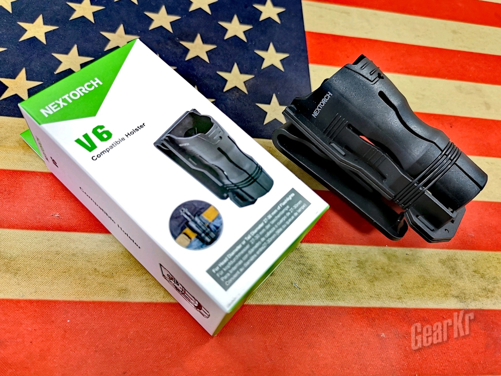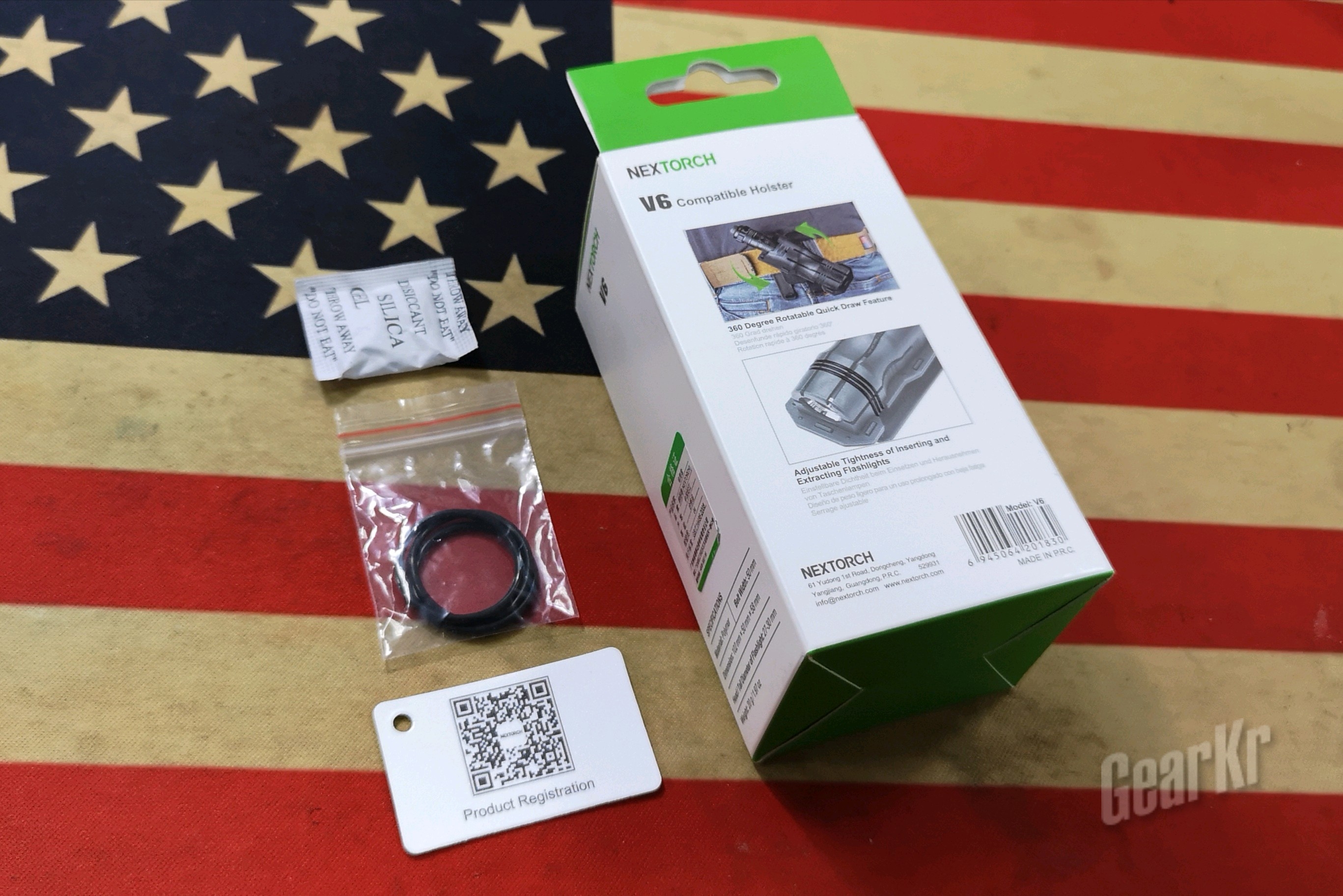 包装依旧使用纳丽德家族式的白绿配色纸盒包装,非常有辨识度。正面为品名、产品写真、使用效果图和用英德法西四国语言标注的产品使用范围:“适用于头径和尾径27-30mm的电筒”;背面则是产品的特色介绍:第一、可360度旋转、快拔。第二、针对电筒直径和个人使用习惯可调松紧度。侧面照例是产品规格和基本数据,而包装内只有V6本体、备用松紧调节橡胶圈、干燥剂一包和一张纳丽德售后服务卡(扫扫二维码,调戏售后妹子)。