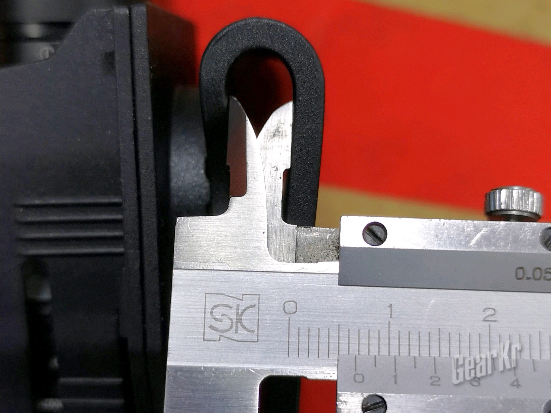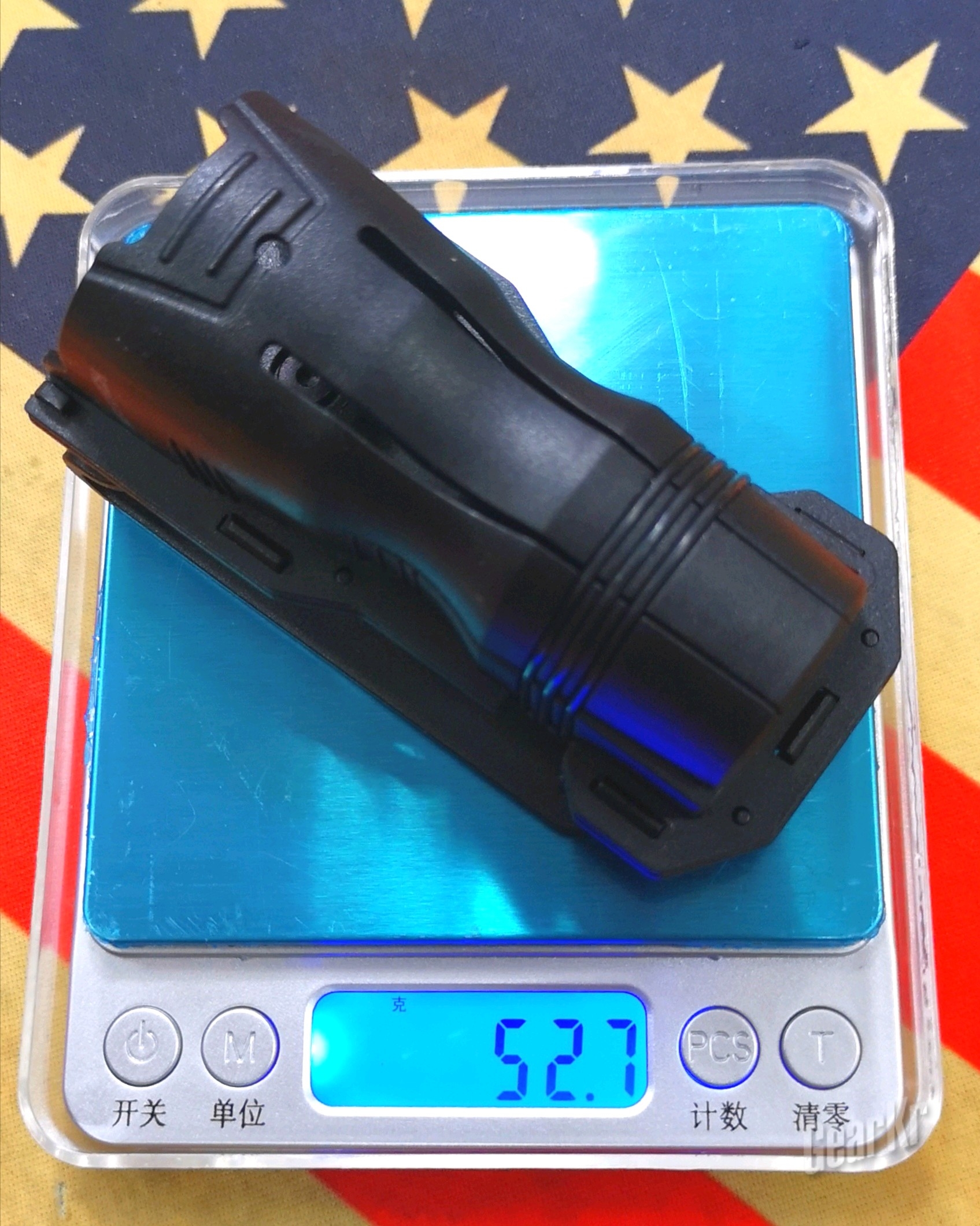 V6本体采用含玻纤的尼龙塑料制成,长宽厚尺寸为102mm*50mm*58mm(最厚处)、标称重20,但是上秤后称得52.7克,相差不是一点点。背夹限位距离上部弯折处内部最大长度为56mm、宽度近12mm,最大可适用50mm宽的腰带。