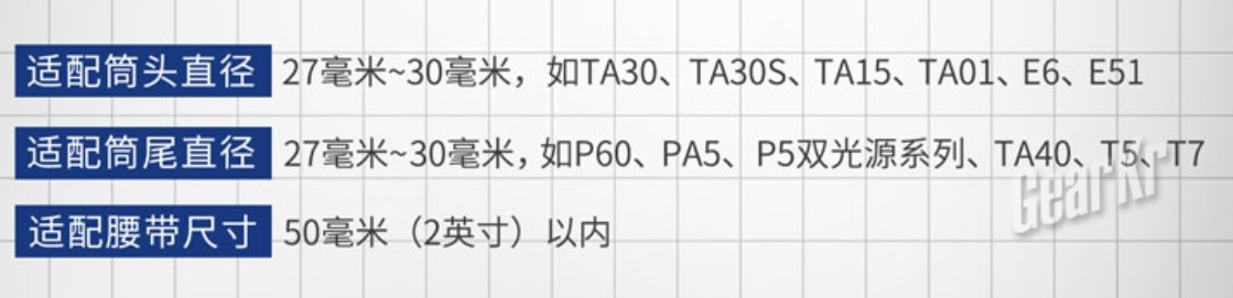 笔者将手上几款不同品牌,筒头筒尾在V6适用范围内的手电,逐一试套,尺寸全部合适。可能是由于三条调节橡胶圈全都装上的原因,在随身携带状态下行走跑跳,也没有发生电筒在筒套内大幅晃动的情况发生。当然,对电筒的固定力过大会对快拔会造成一定影响,所以在针对不同筒径电筒时,为了平衡快拔舒适度和固定强度,我们可以根据实际情况选择性的增减橡胶圈的数量,并且另外提供3条线径2mm,直径22mm的橡胶圈以备替换和补充。