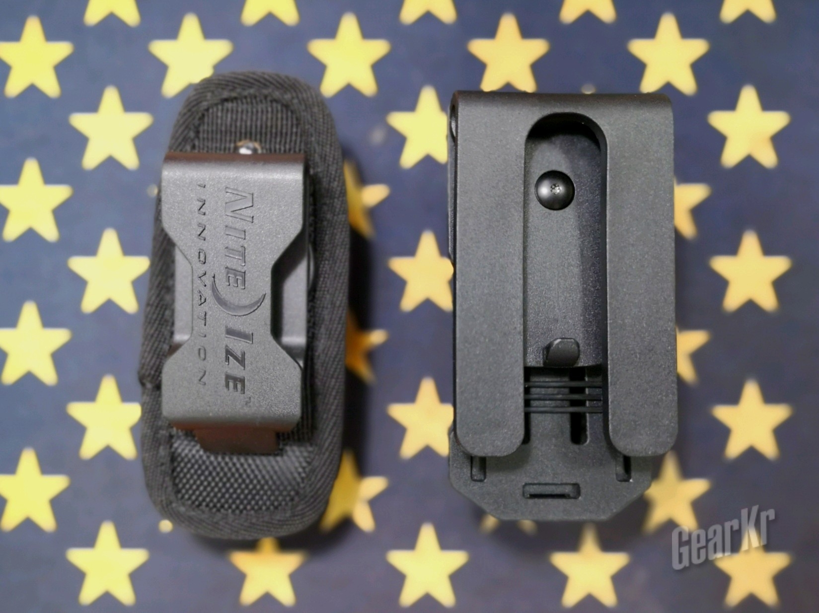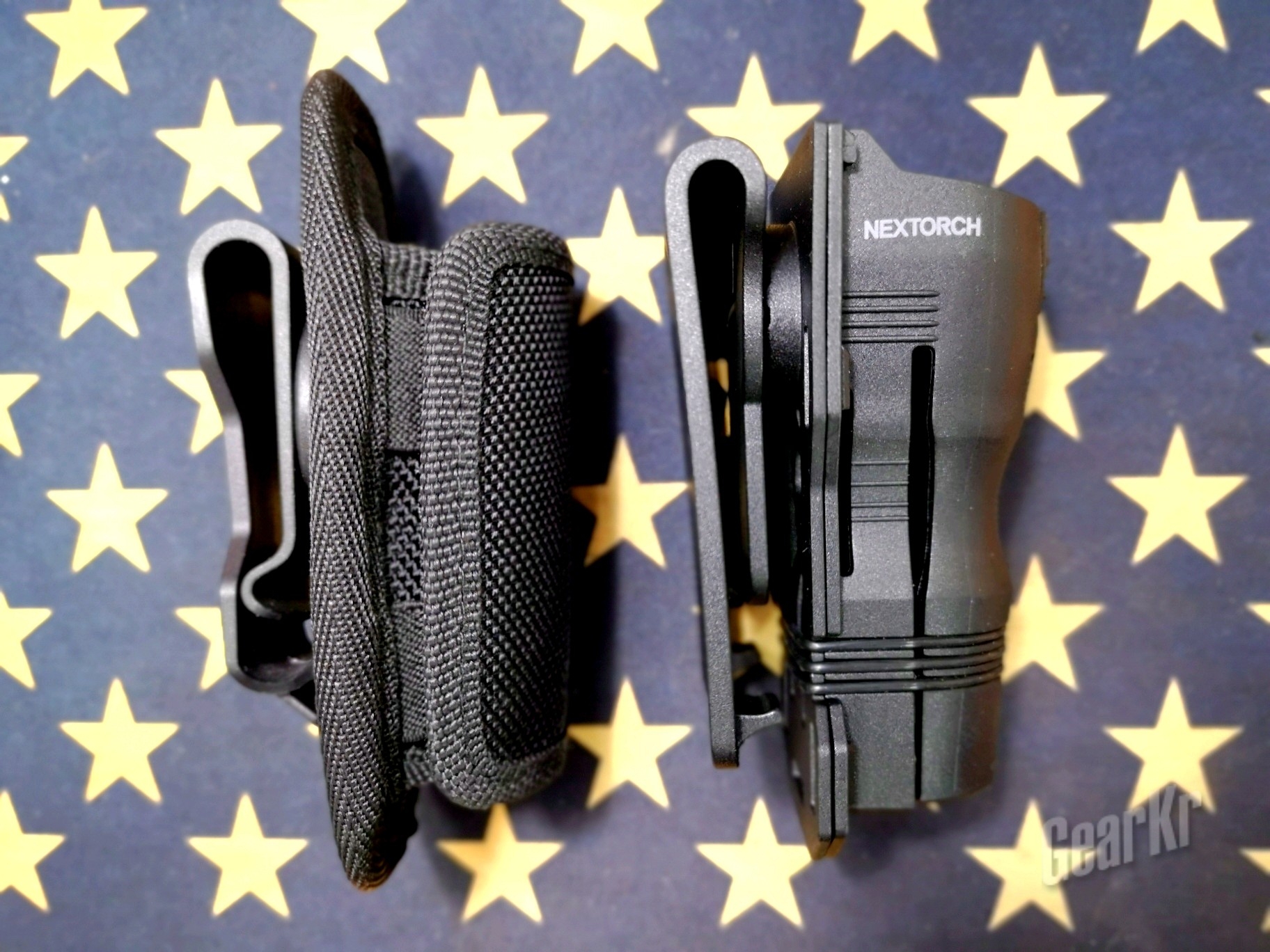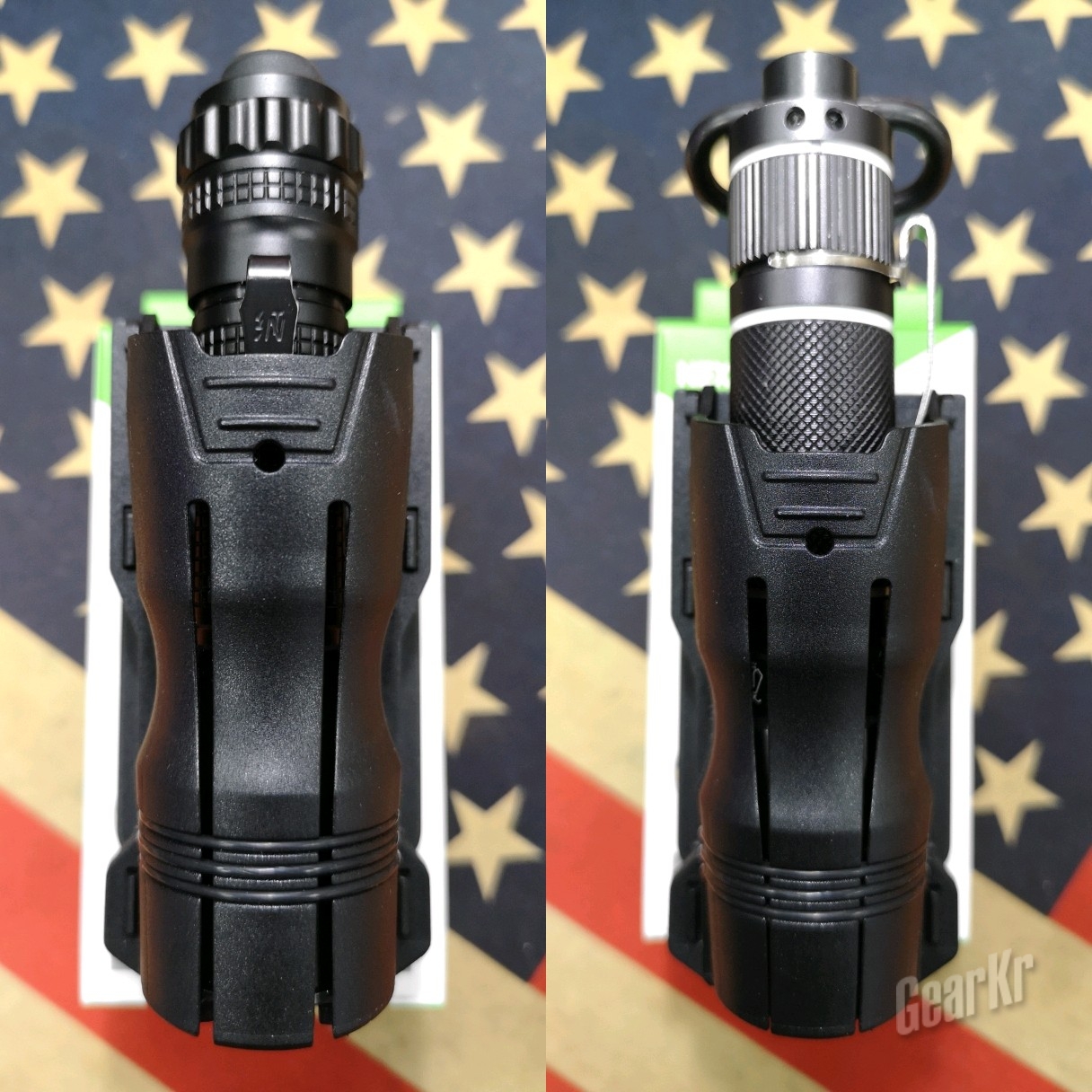 最后翻出此前笔者一直在用,同时也是纳丽德代理的美国奈爱公司的通用型电筒套来做个小对比。两者同样采用半包括式筒套本体、档位式360度可旋转(奈爱8档限位/纳丽德v6 16档限位)、防脱出型腰带背夹和底部通光设计,但两者区别和优劣也很突出。
