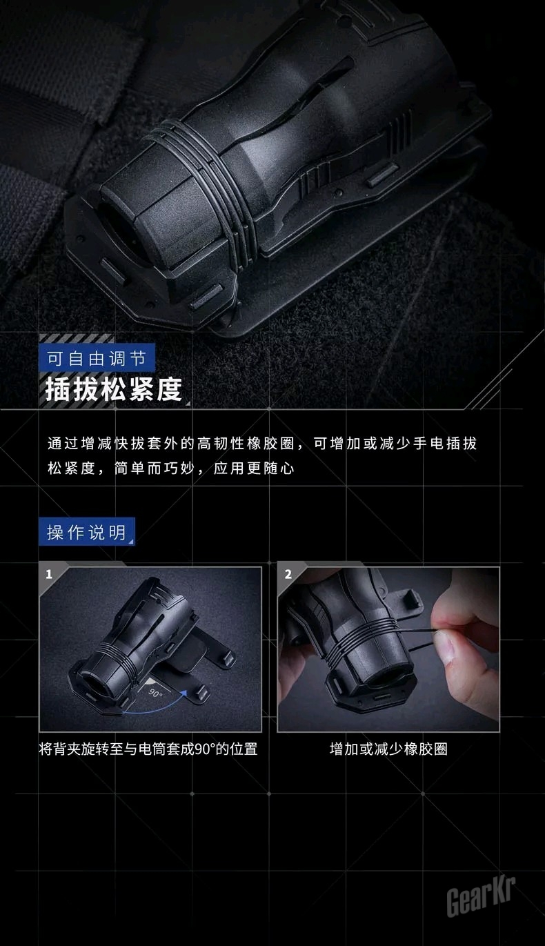 其中外套罩壳和快拔阻尼板通过两者本身的卡扣可以组合成筒套本体,再由三条橡胶圈套在底部三条限位槽内。在实际使用中,内侧的条状阻尼板产生的弹力,对插入的手电有一个持续性的力来防止手电在剧烈运动情况下从筒套内脱出,同时防止电筒在筒套内晃动/蹿动并产生“咔嗒咔嗒”的噪音,为战术行动带来可靠的保障。而被橡胶条圈住的三片式底部爪片能够对不同粗细的筒径实现自适应。