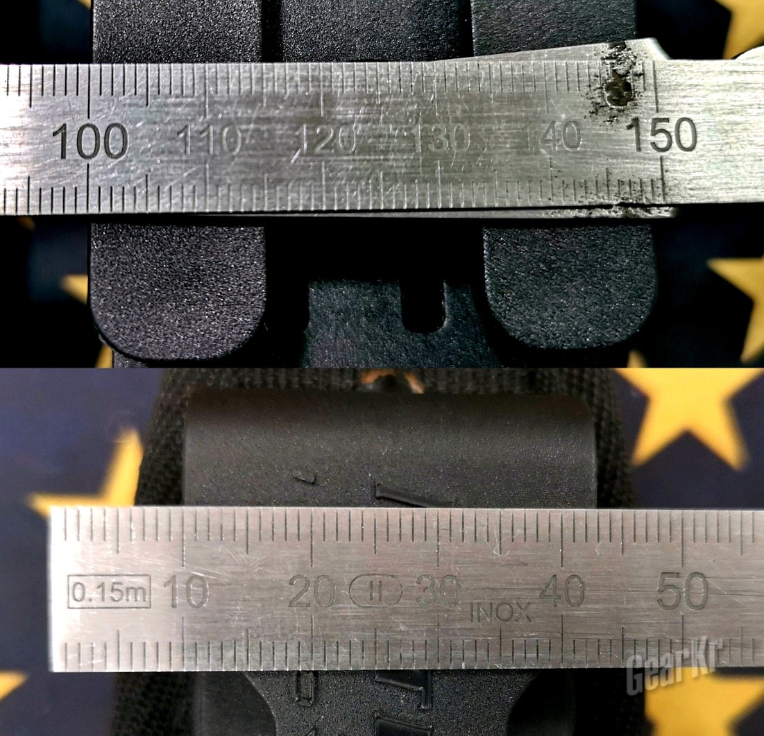 最后,背夹设计上,V6的“п”型设计通用性更好,背夹总宽度50mm、两条“腿”各宽15mm,底部各有一个防脱出挡钩,使得V6在适配50mm宽的各种内外腰带以外,也可以使用在各种MOLLE系统上(战术背心、战术包具装具、战术腰封等)。