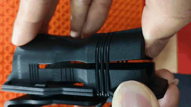 然后是保障电筒在筒套内的固定方式:奈爱使用上下各一条弹力织带来提供弹力;V6是与筒套内板一体的弹力片结构+可调松紧度橡胶圈设计来提供弹力。奈爱弹力织带无法调节松紧度,在弹力织带老化后无法替换。在这方面,V6都有绝对优势,更何况哪怕所配的备用橡胶圈全部用尽,也可以在网上方便的购买到线径直径相同的橡胶圈来替换使用。