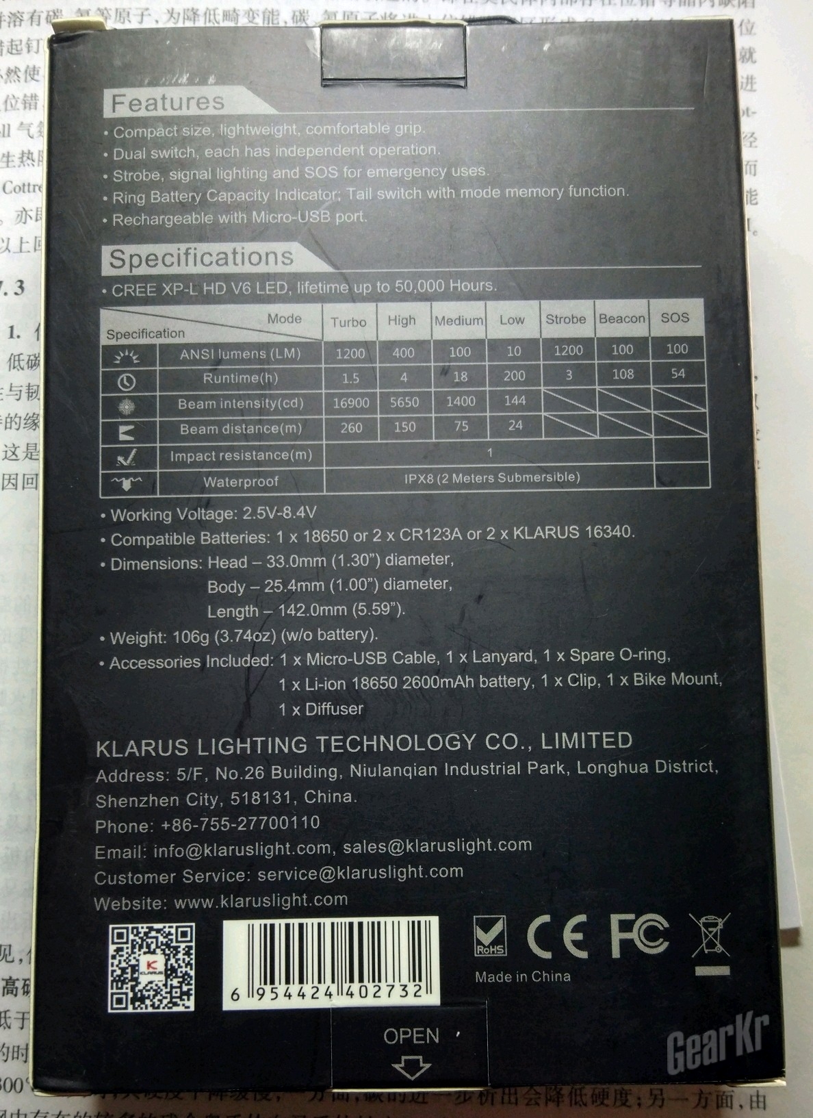 包装正面印了手电本身的图案,并标了最高亮度1200LM,右上角的红标英文翻译“包括电池”,也就是说这次ST15R是自带电池的