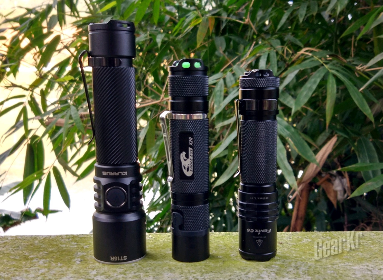尺寸对比,从左往右为凯瑞兹ST15,鹰眼X2R,菲尼克斯C6。三款手电均使用18650电池,可以看到ST15R的个头并不小,毕竟定位是一款户外手电而不是EDC,不过还是能塞进口袋的,就是会有一个诡异的迷之凸起╮(‵▽′)╭。