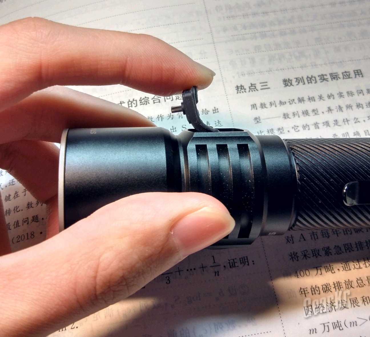 手电筒身采用6系铝合金,表面黑色阳极氧化处理,这都是各大厂商的标准配置,同时凯瑞兹还对抱夹做了镀黑钛处理,使得整个手电除了压环外基本为黑色,非常低调。手电整体外观设计中规中矩,不过螺旋防滑纹还是比较吸引目光的。