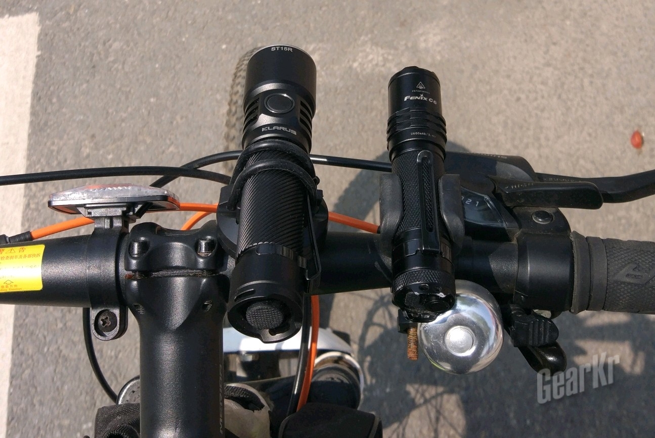 日常骑行颠簸对于手电架都是小意思,所以我在骑行时故意将前轮抬起重落了几次,手电架依然稳固,没有前倾后仰,看来手电架虽然作为附件,但是凯瑞兹并没有敷衍的用些劣质件,嗯,良心,尤其是在300这个价位。这里建议安装手电的时候,尽量安装在防滑纹靠近侧按的位置,这里差不多是重心,能避免骑行颠簸造成手电上下倾仰。