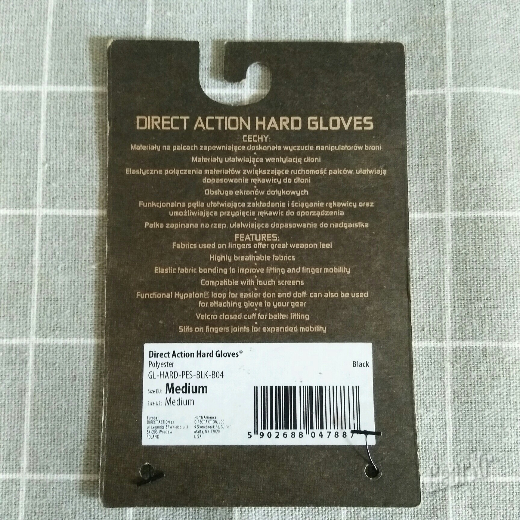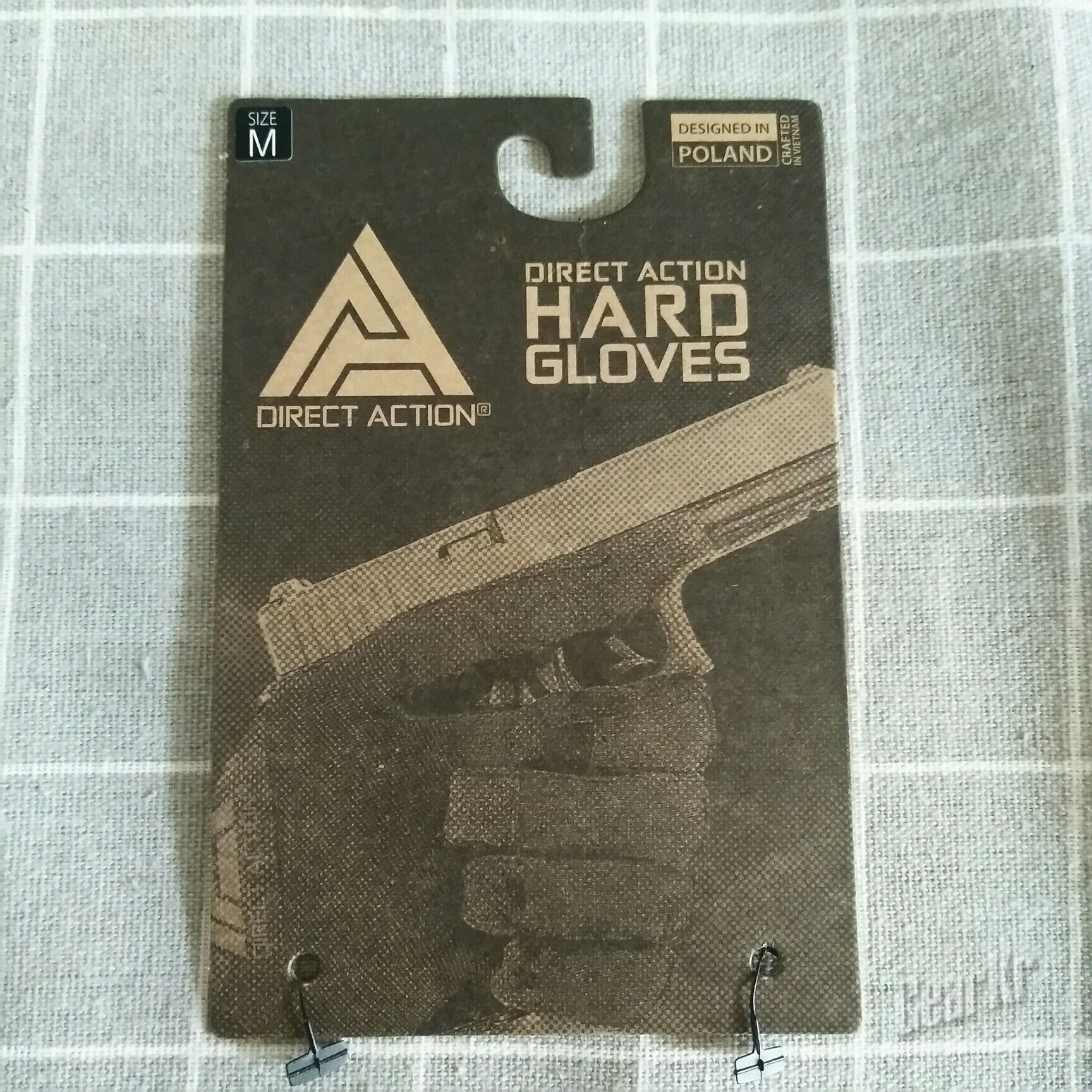 拆除外包装,手套就是下面的样子啦。手套上有标签,标签上的信息与外包装一致,还附有手套性能的英文介绍,另一面则是使用该手套持某手枪的一个美图,旁边还有Direct Action大大的logo。