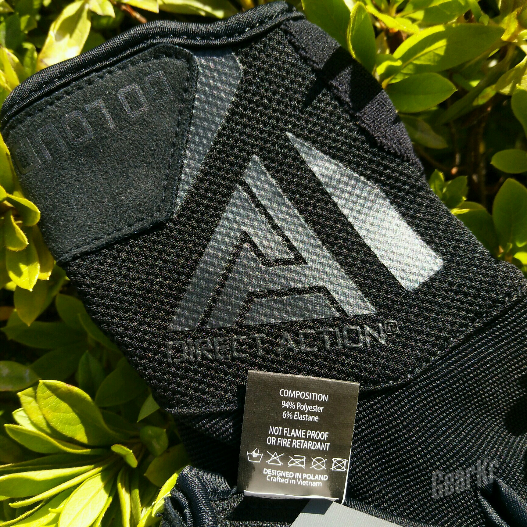 手套内部标签位于手腕背部,标签其中一面是logo、型号以及尺寸,另一面是材质(94%Polyestet<聚酯纤维>,6%Elastane<弹性纤维>)、洗涤方式以及“波兰设计,越南制造”文字。另外,标签上还有提示此款手套不具有阻燃功能。