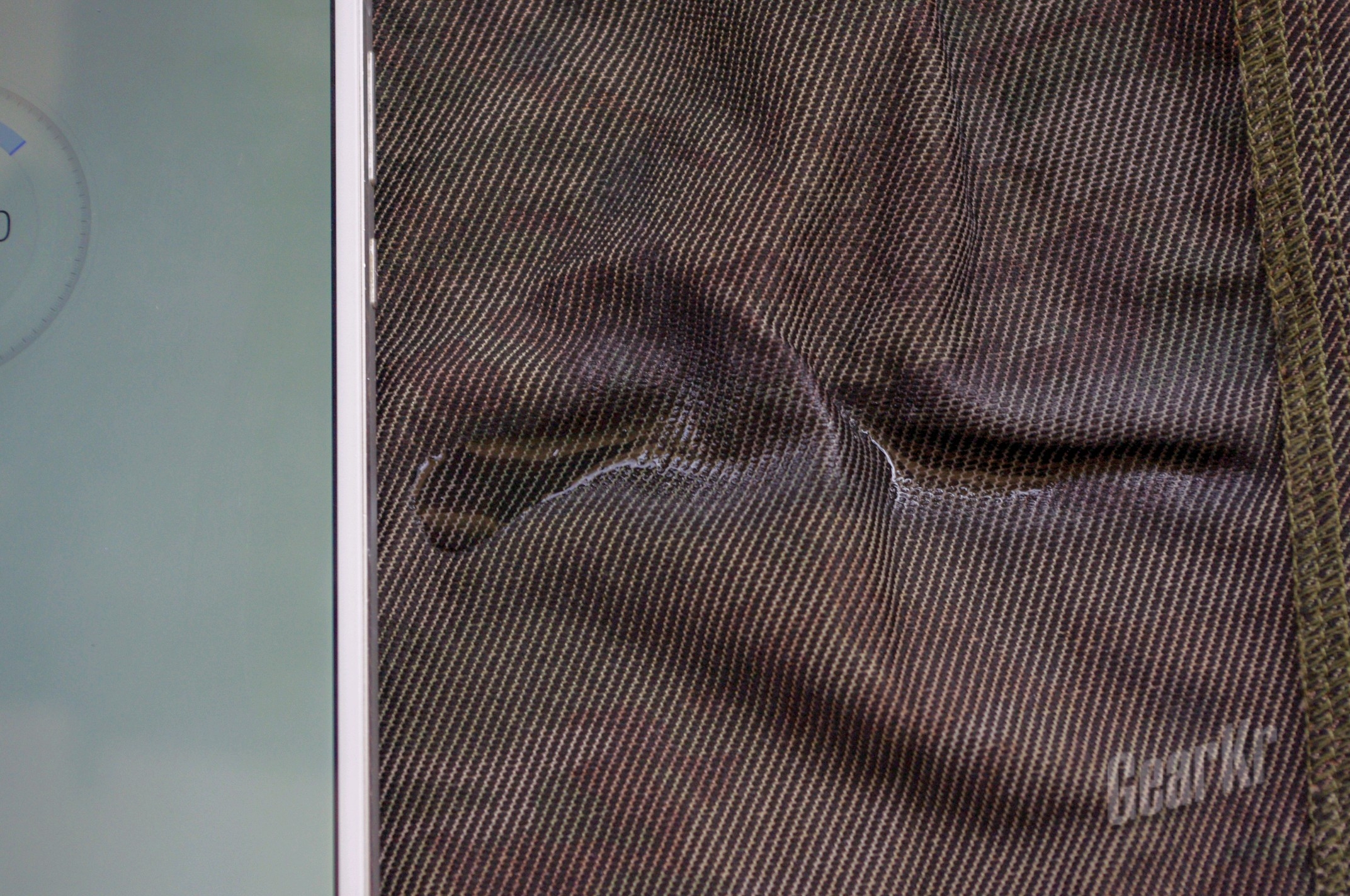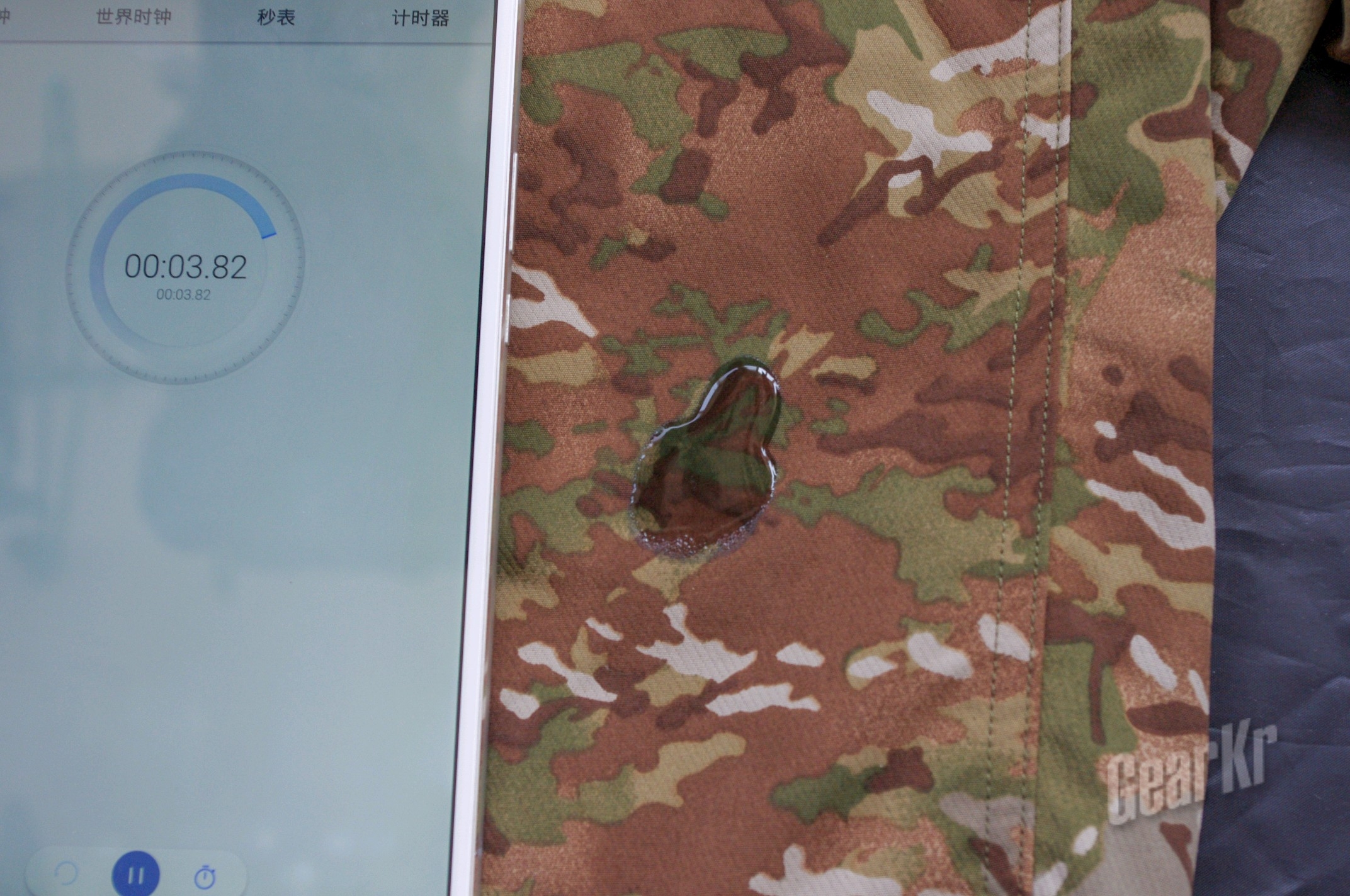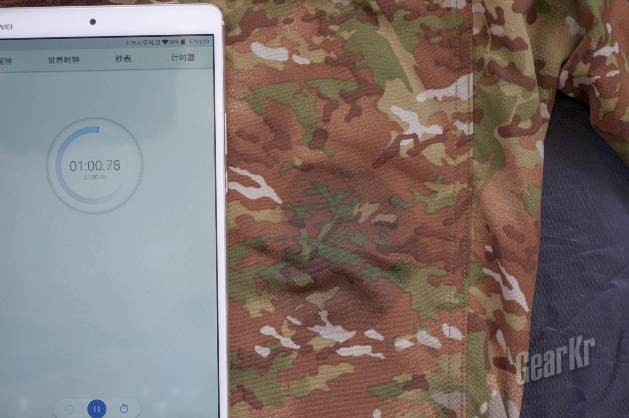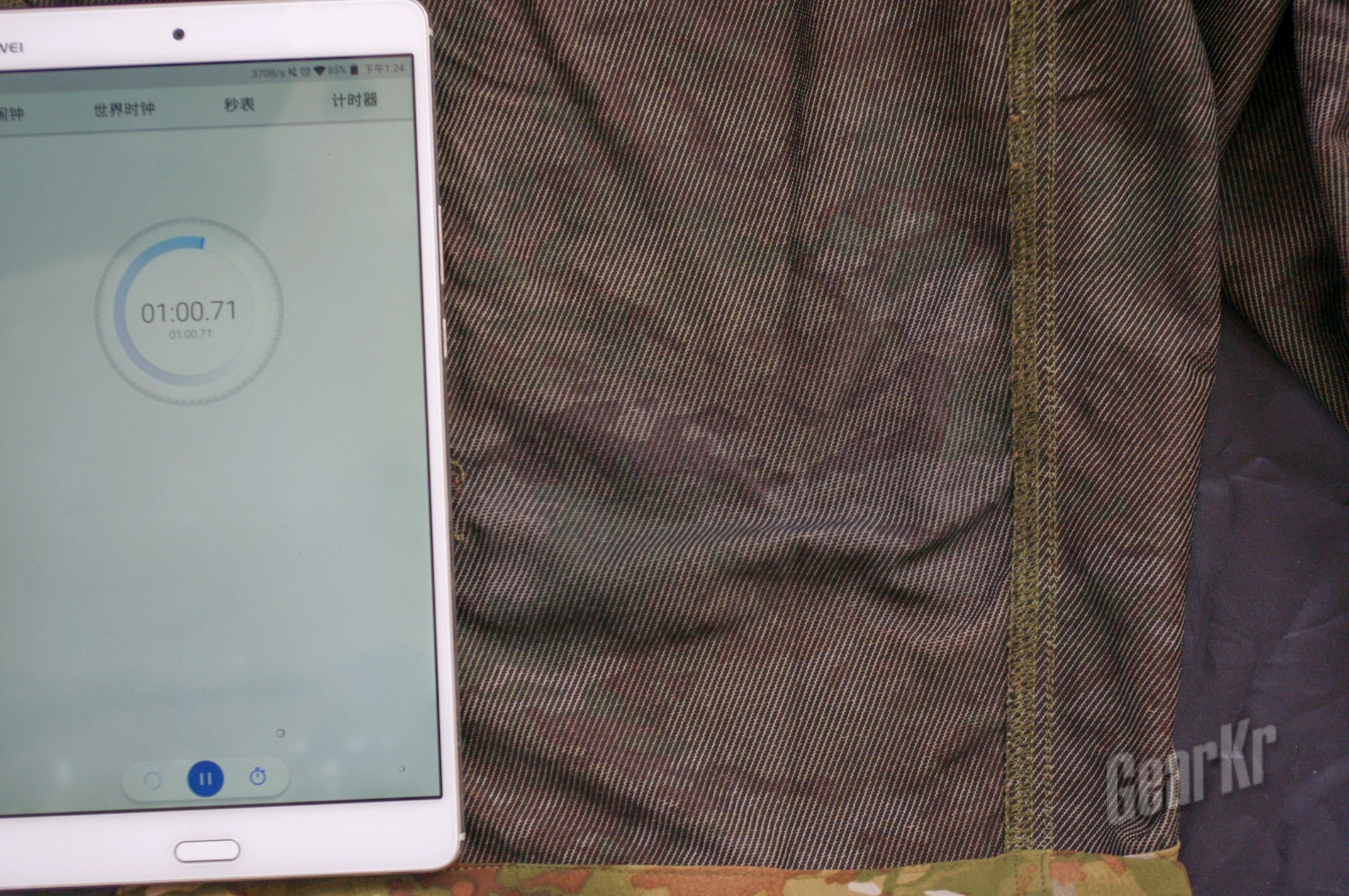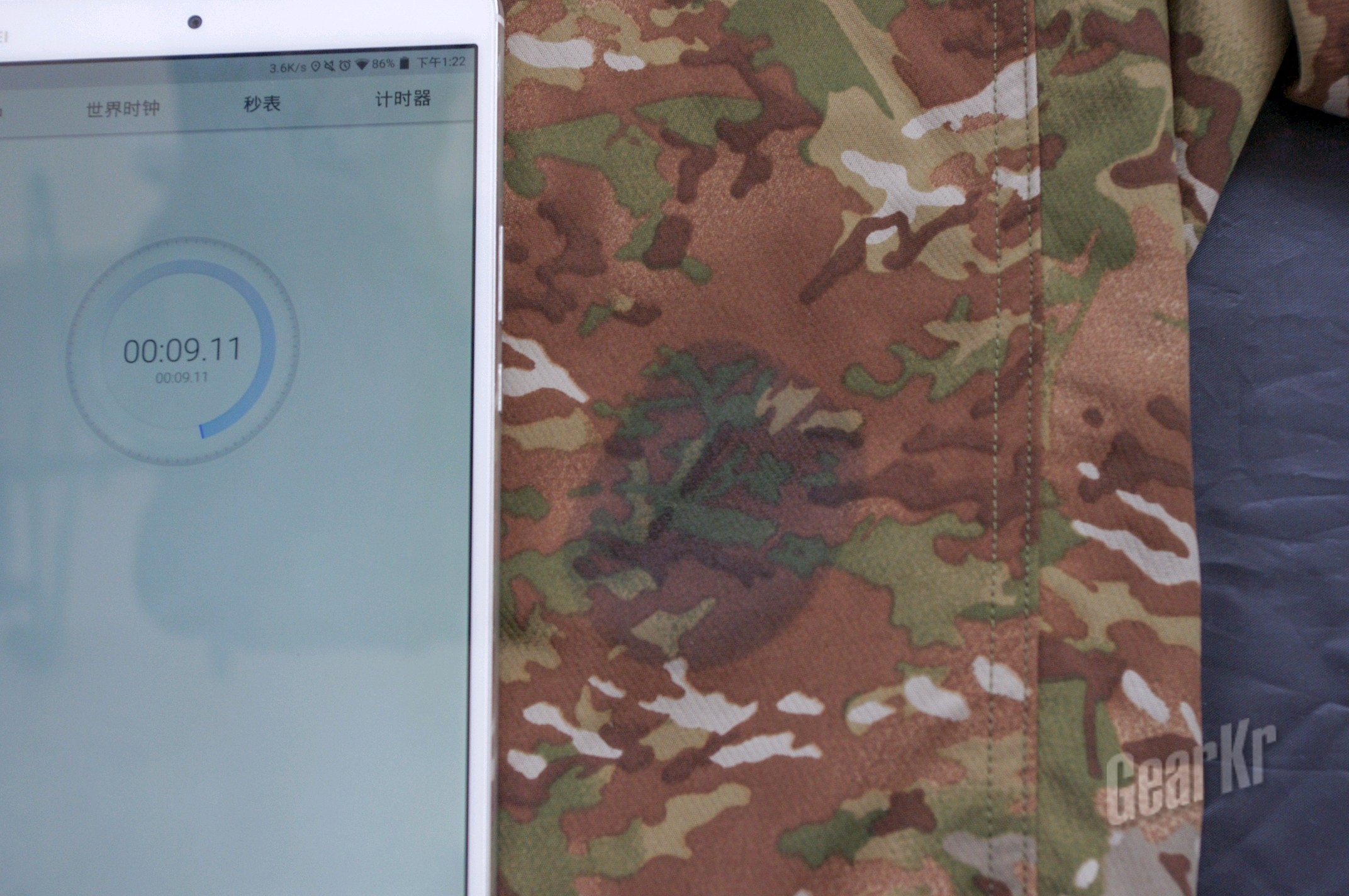 事实证明内侧单导面料的排水确实是有用的,我甚至滴上水都没来得及拍照就已经被吸收了,再看一分钟后的样子水迹已经基本不可见,触摸还有一点湿润,注意是一分钟后,