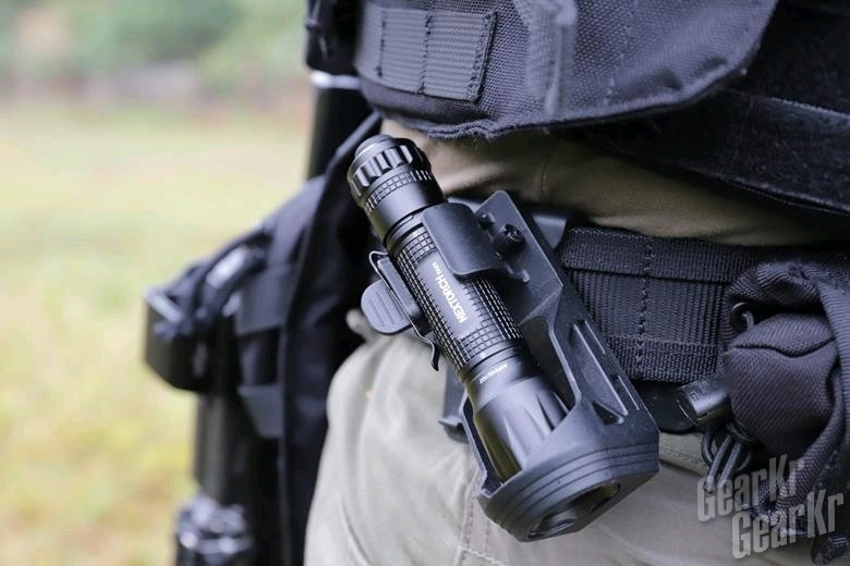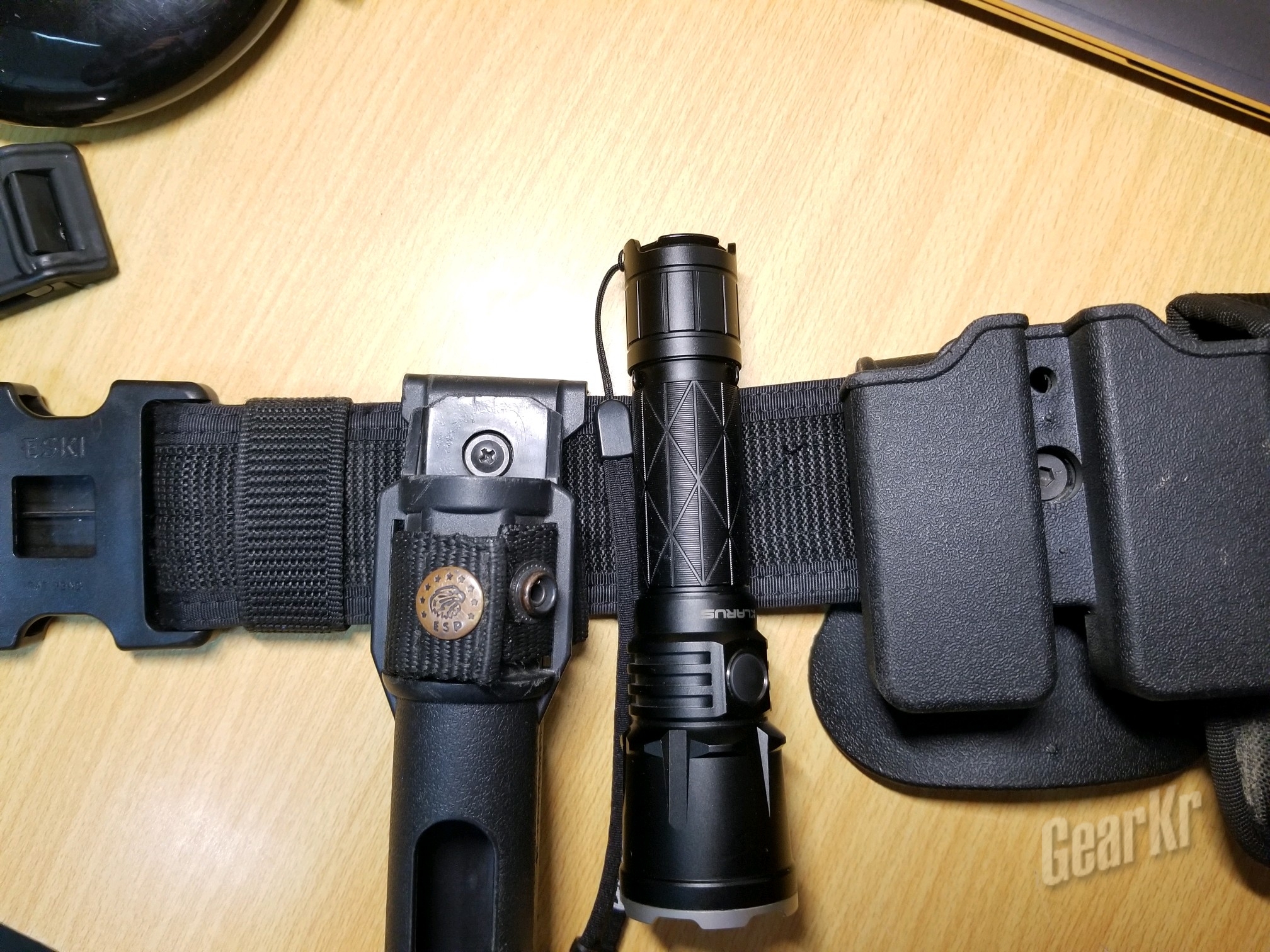 战术携行,出任务或者大多数时间是执勤的时候,手电的携带一般是放在腰带上,也有少数挂在战术背心上的。那么原装的手电套是一个布套,底部有保护误按的盖子这个设计倒是很实用,背后是魔术贴的固定条。