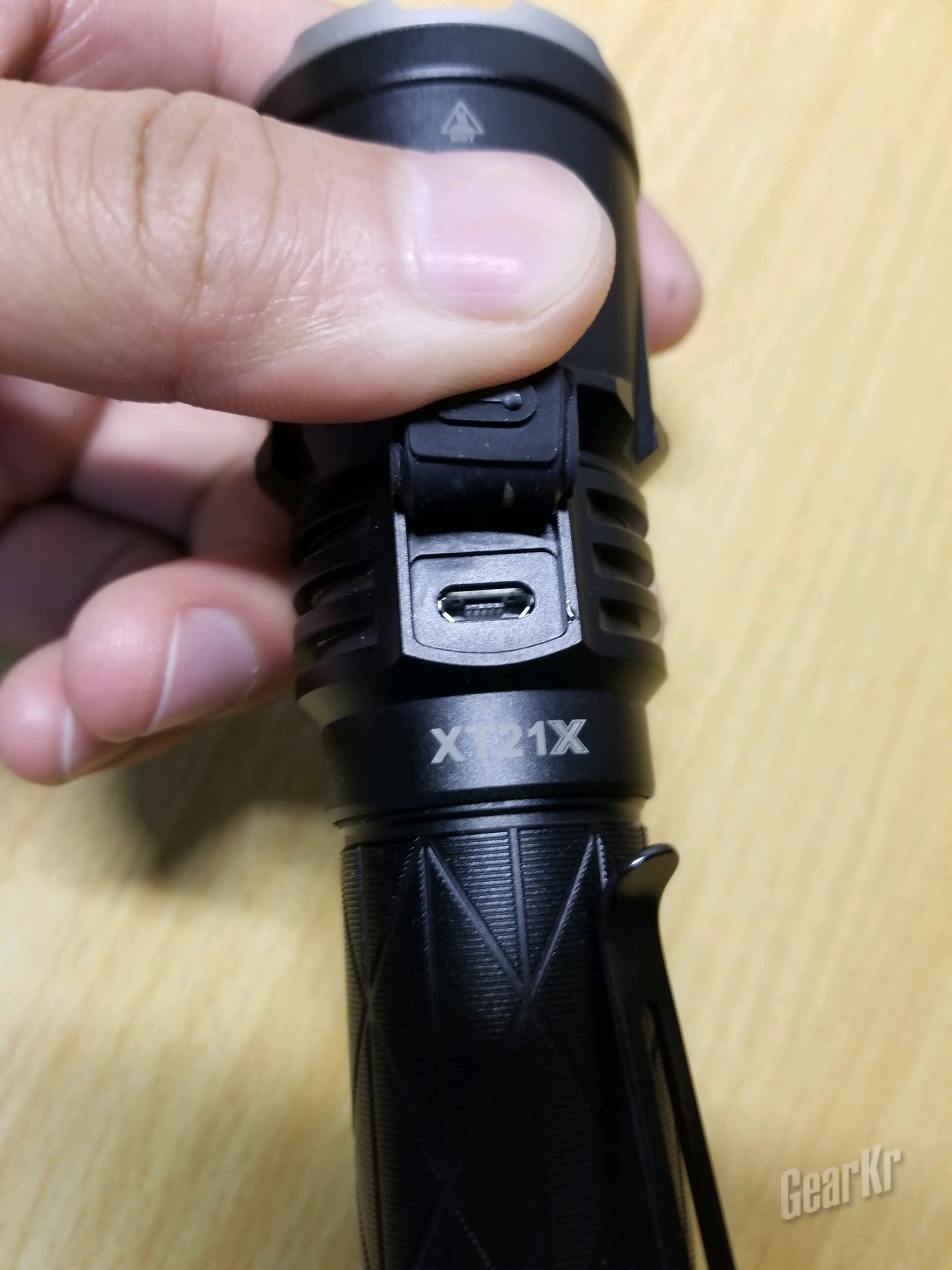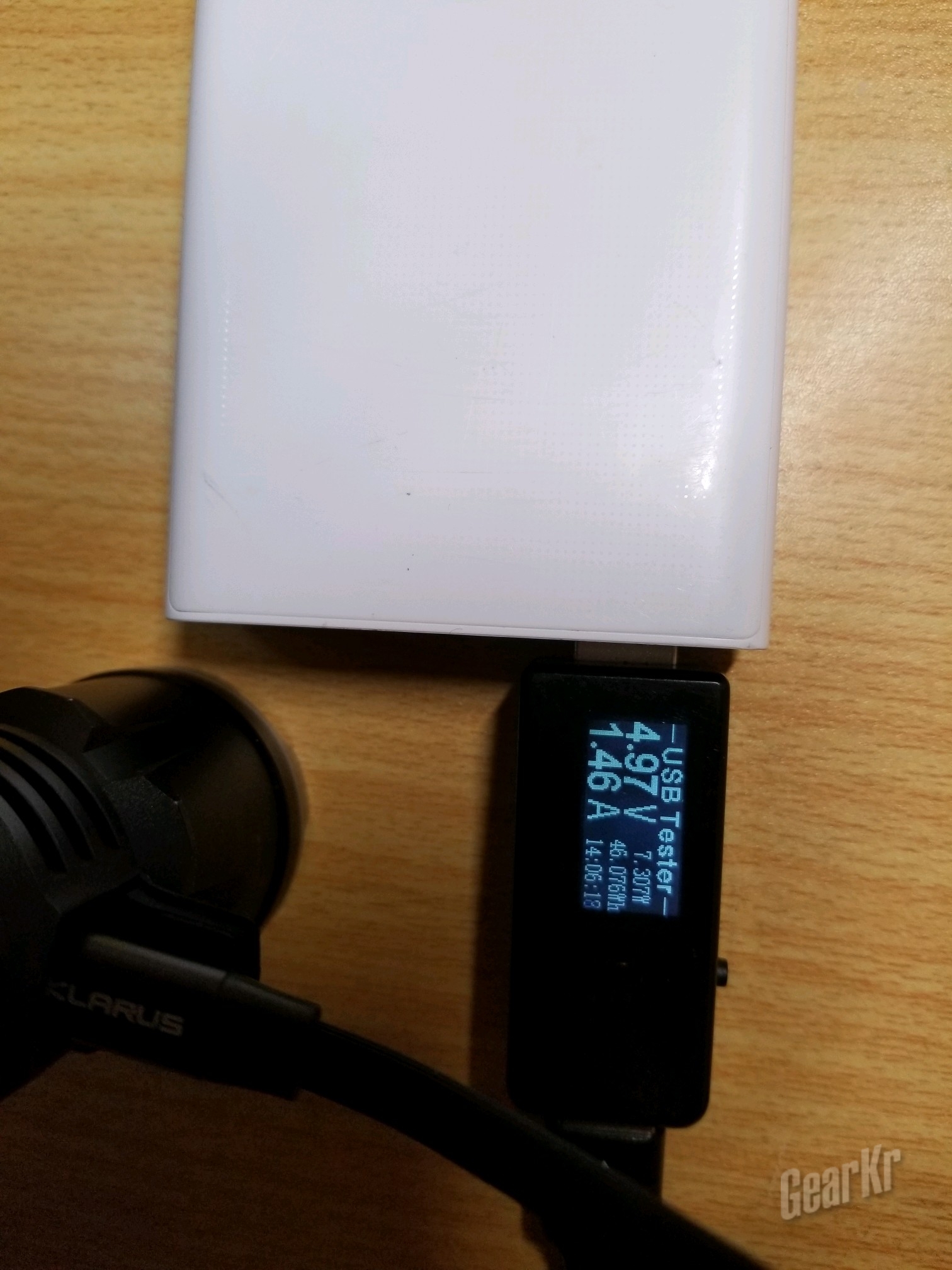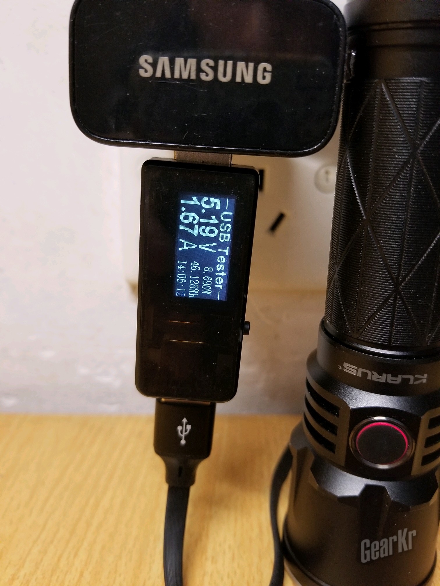 功率分别为6.19w、7.30w、8.69w,不知道这个算不算支持快充,但是看起来没有达到三星充电器的最大输出功率。使用苹果充电器,从手电亮红灯(电量30%以下)到充满电,大概用时三个多小时,已经不错了,至少满足一般的任务准备时间。再说说续航,只要不是用极亮档当作照明器材长时间使用,一般用中亮观察、极亮进行短时间“点射”,用上两个半夜应该没问题。2.充电方法:还是秉持了凯瑞自一贯的插口充电,