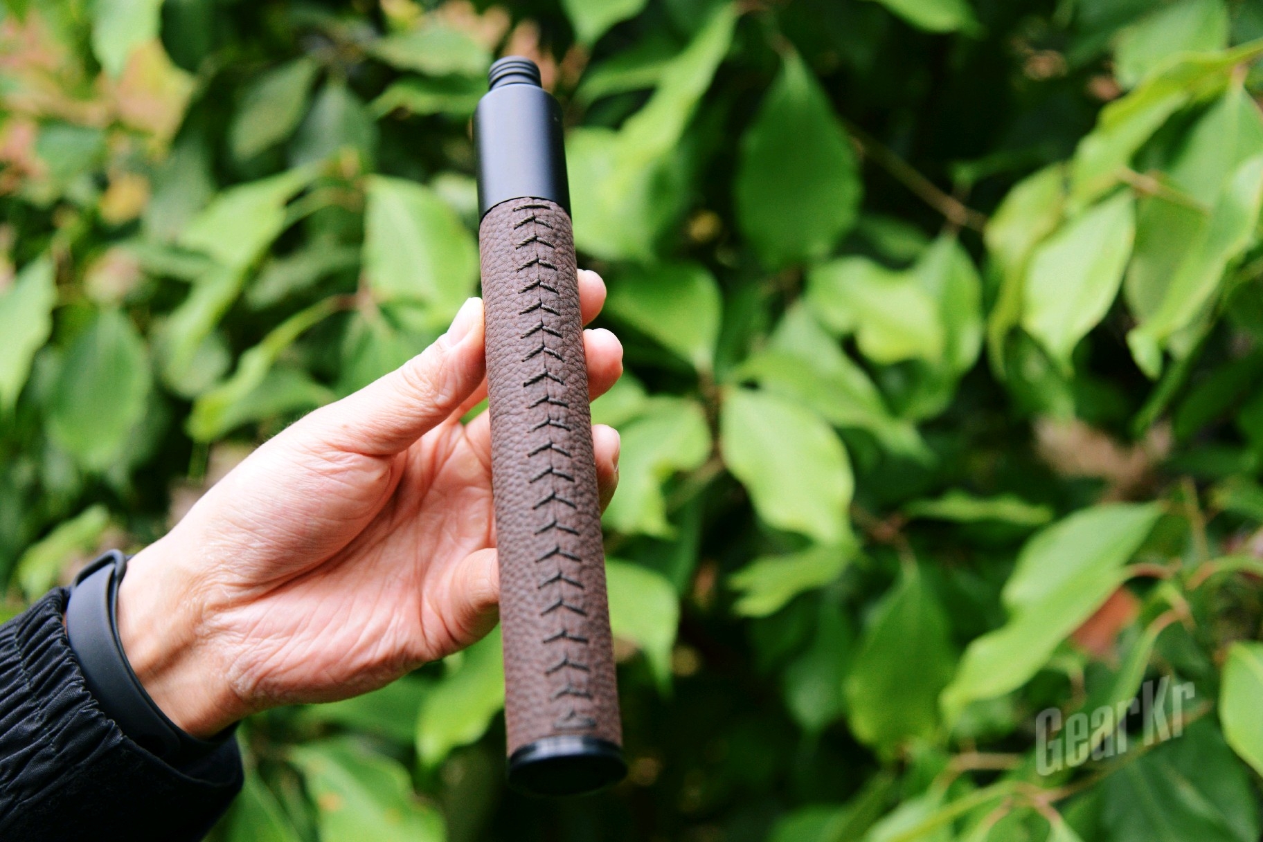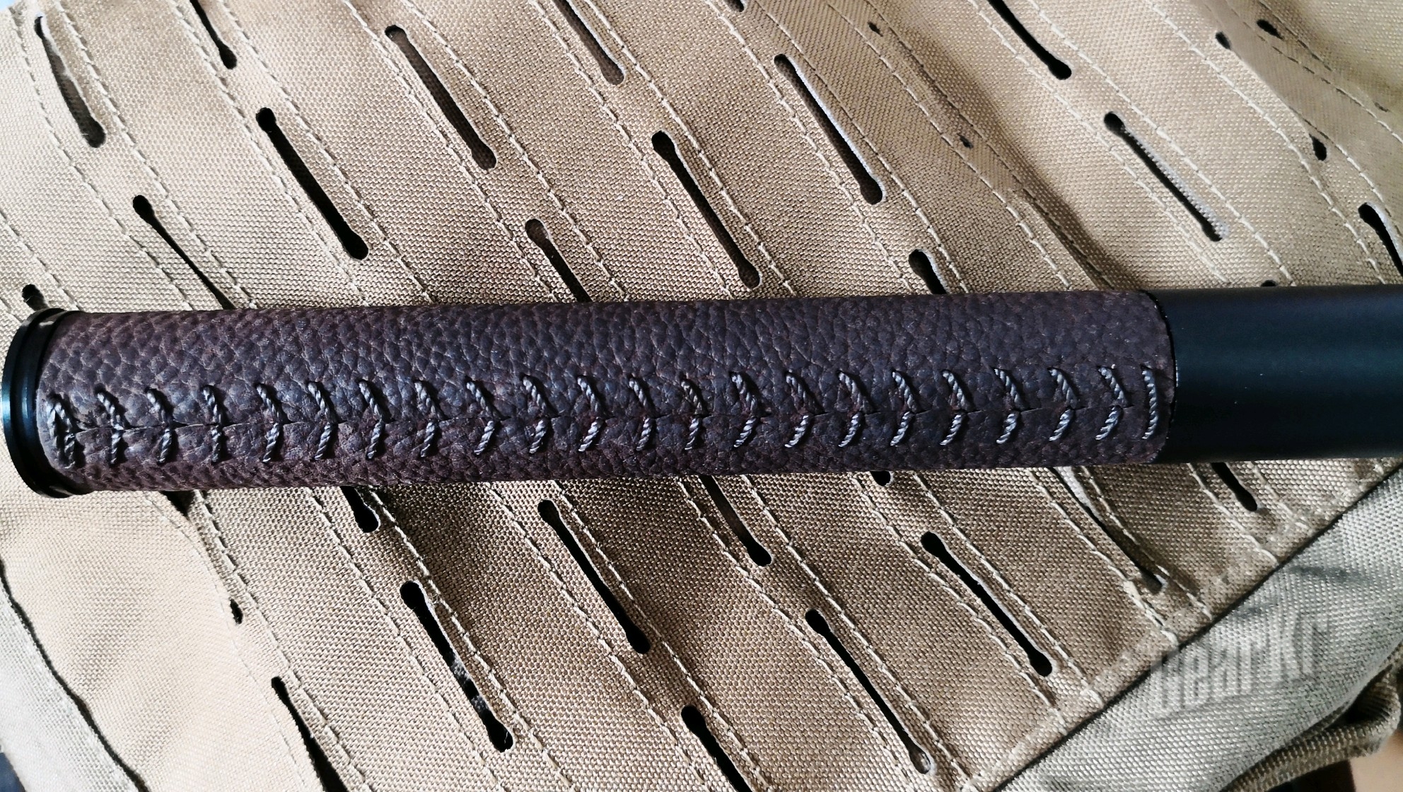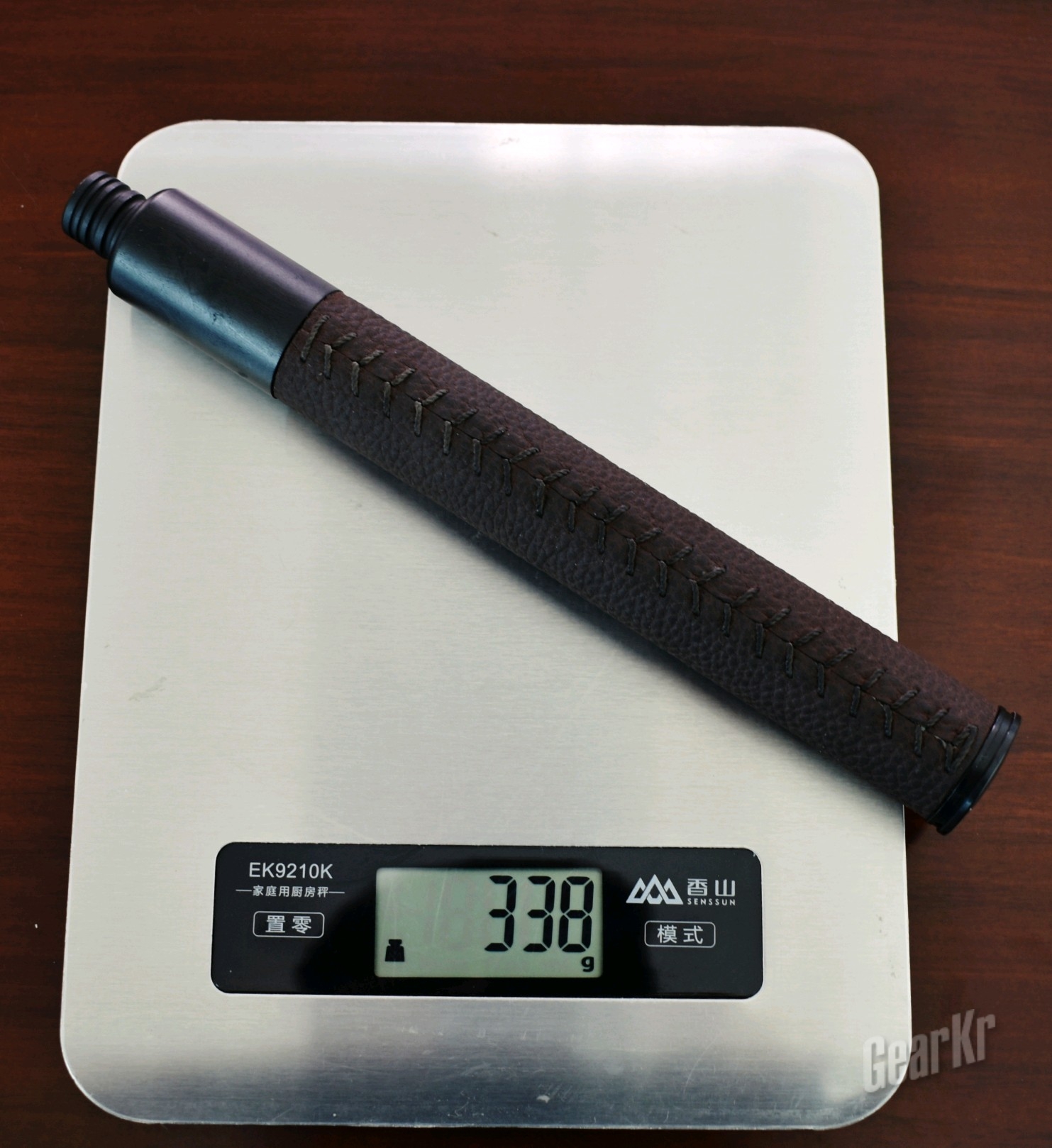(二)外观:首先映入眼帘的是牛皮柄,虽然早有准备,但还是有些惊喜的,现行市面上的伸缩棍大多只能在棍身的材质跟手柄上下功夫,手柄有橡胶或、乙烯基发泡及胶皮材质,但使用牛皮材质的,据我了解,是首创;