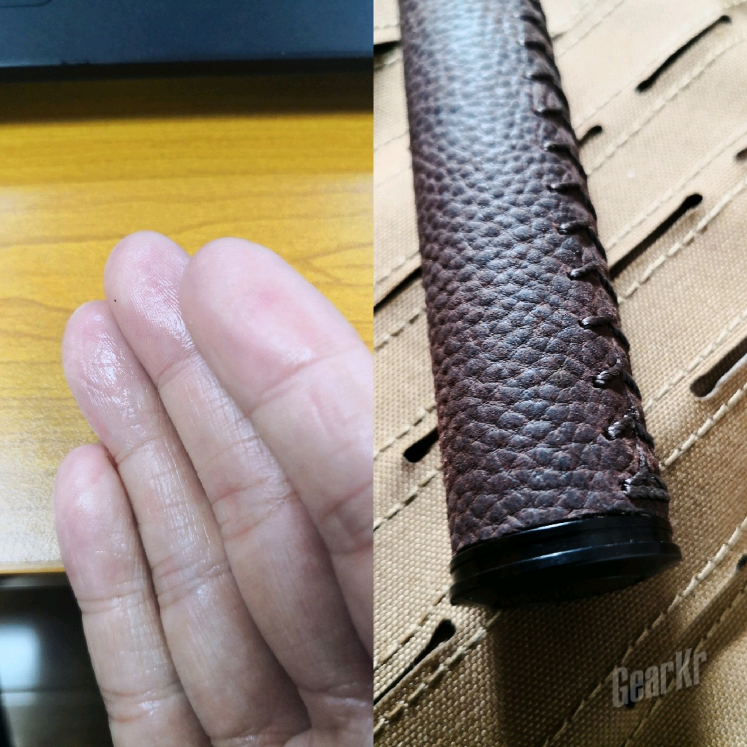 (三)日常:笔者手汗较大,为了更好地检验皮套的透气和吸汗性能,在不戴手套的情况下,在不同时段多次(每次时间5分钟)做了劈、戳、撩等动作, 皮套的吸汗性能比我想象中好,不像胶皮手柄那样对汗液的吸附性差,透气性能跟发泡海绵相比,个人觉得相差无几。