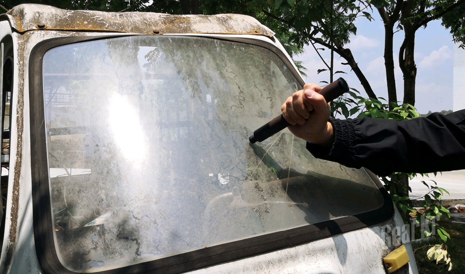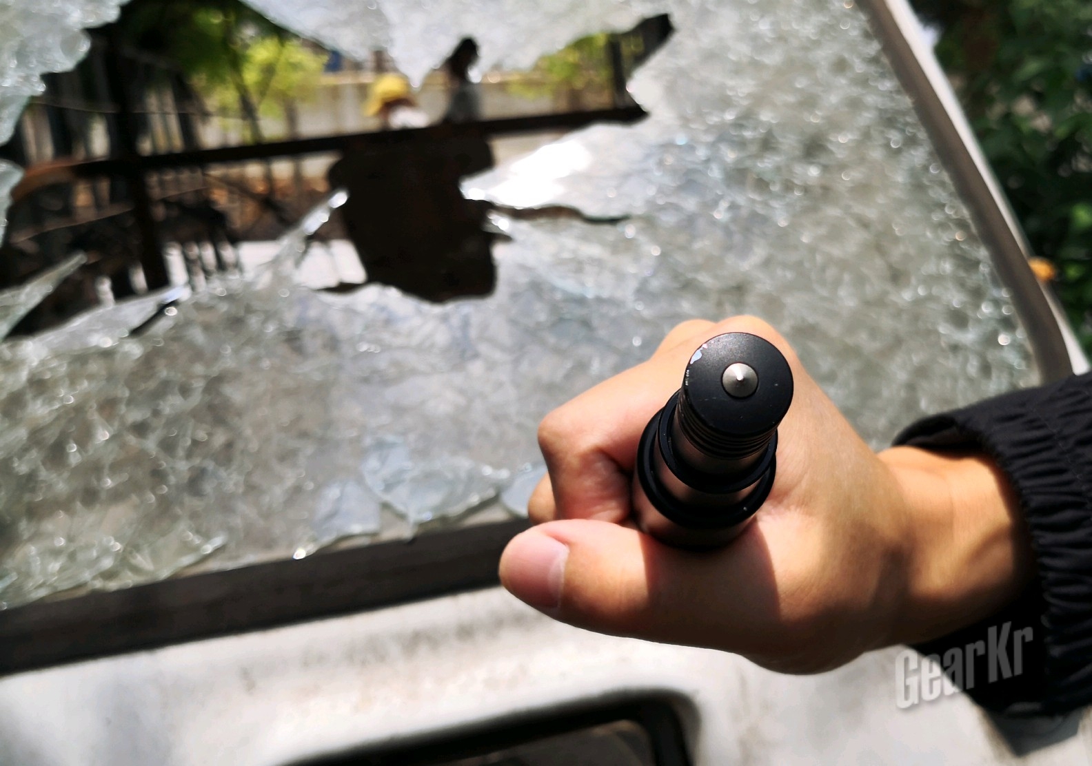 (六)破窗:这个是最让我惊喜的设计,而且破窗效果杠杠的,笔者先后试验了摩托车后视镜、三轮车车窗玻璃。