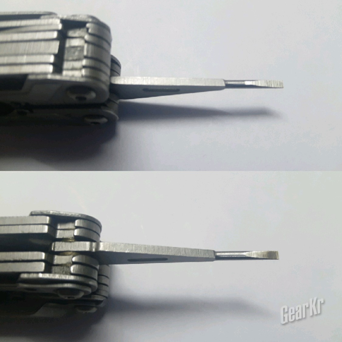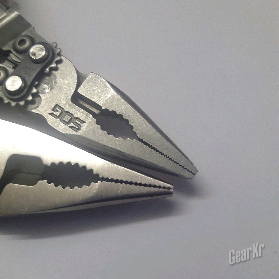 在钳头的设计上,PP1001也可圈可点。钳头齿纹的设计上,SOG使用的是互相咬合的设计,使得其能够紧紧咬合住纸张这样的细薄物件。而莱钳的齿齿相对,使得咬合时作用部分较少,且受磨损影响较大。