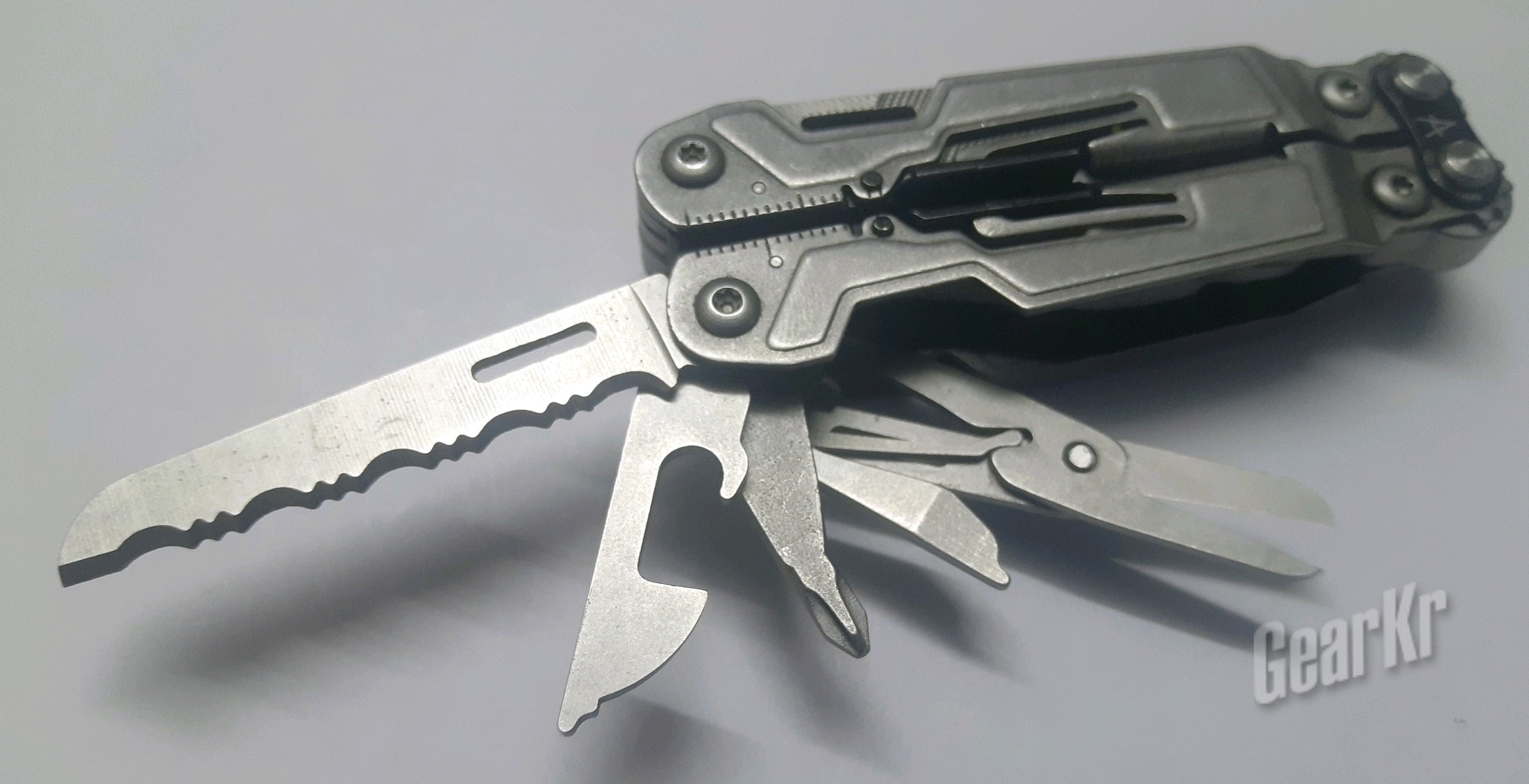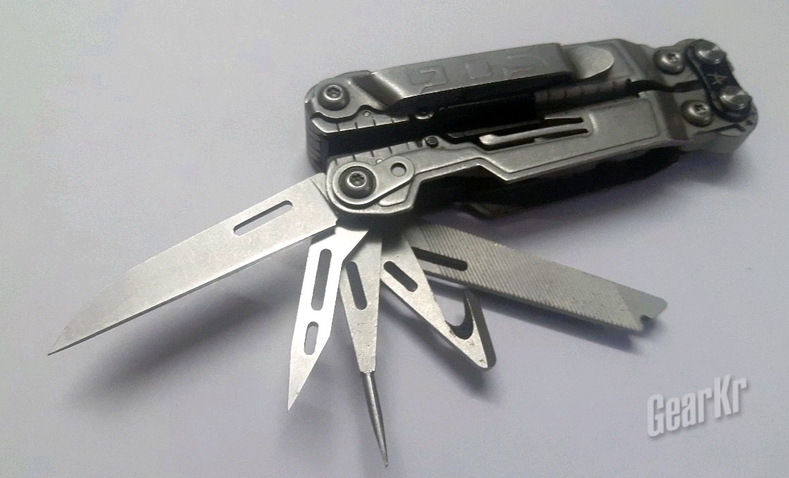 背夹侧,集合了:剪刀,开瓶器,十字螺丝刀,开罐器,齿刀。