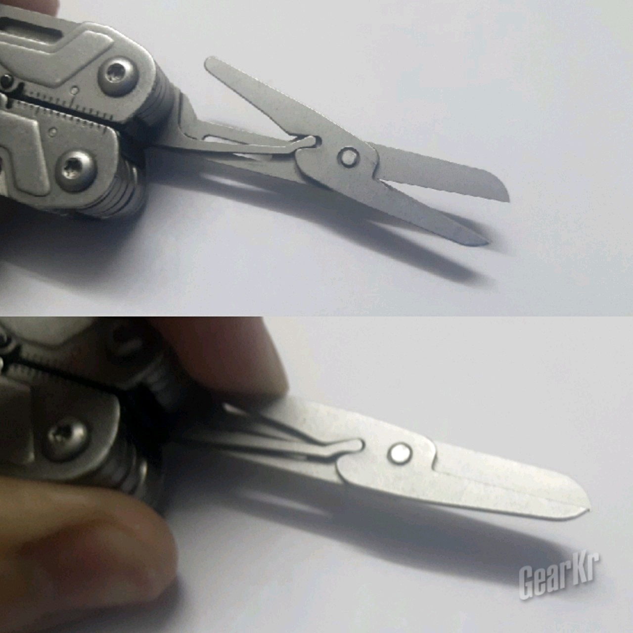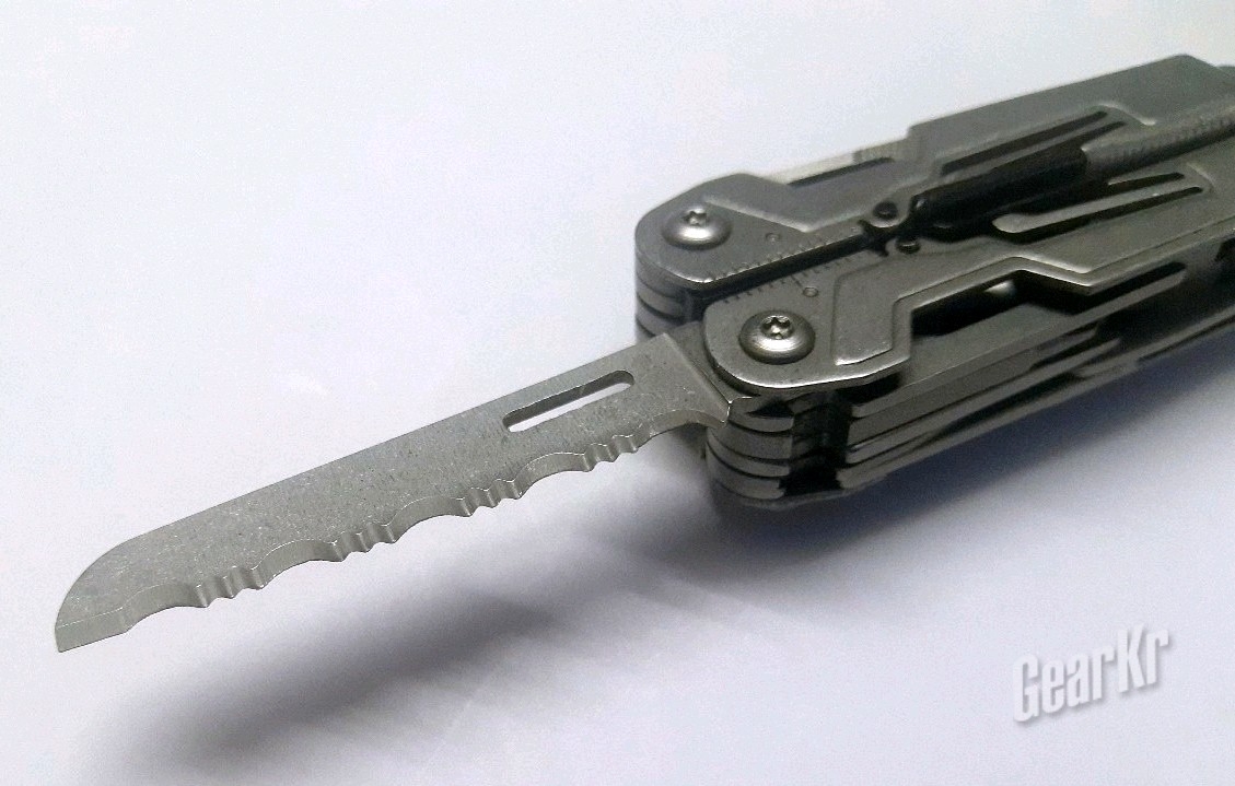 剪刀这个工具,简直是设计师和模具师同时疯掉。因为整体钳子就不大,这个剪子也不可能大。又因为提供回弹力的金属杆也限制了移动,实际能用的切割长度只有一厘米半左右,使用上实在膈应(本人手长约A4宽度)。另外,两片刀片大小不一,两片刀尖都不在一个线上,加工不敢恭维。另外,两片刀片并不平行,而是向中间弯,有效保证了这种小剪刀的切割,但也使得使用时阻尼感和卡滞感明显。而且由于厚度,经常不知道怎么的就和钳头卡住了。。。。
