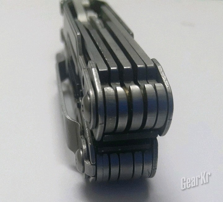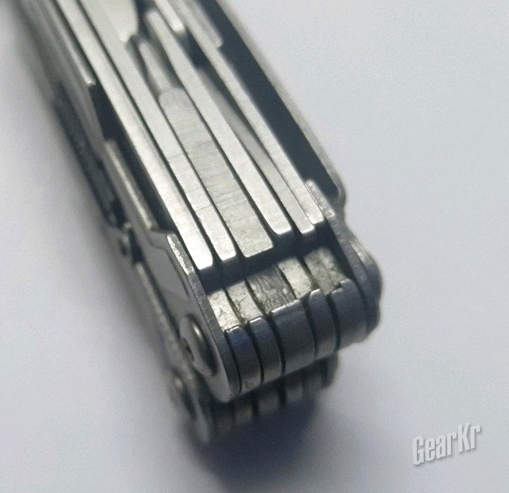 还有,这个齿轮结构还能起到一定助力的作用。在GearKr的视频中,曾说到这一点:钳头张开同样角度,SOG的手柄张开度数大于莱钳的手柄角度。对于PP1001这样一把小钳来说,手柄的运动角度大于钳头,反而能起到剪切时的助力的作用,一定上,弥补了其尺寸太小、握持膈应的问题。