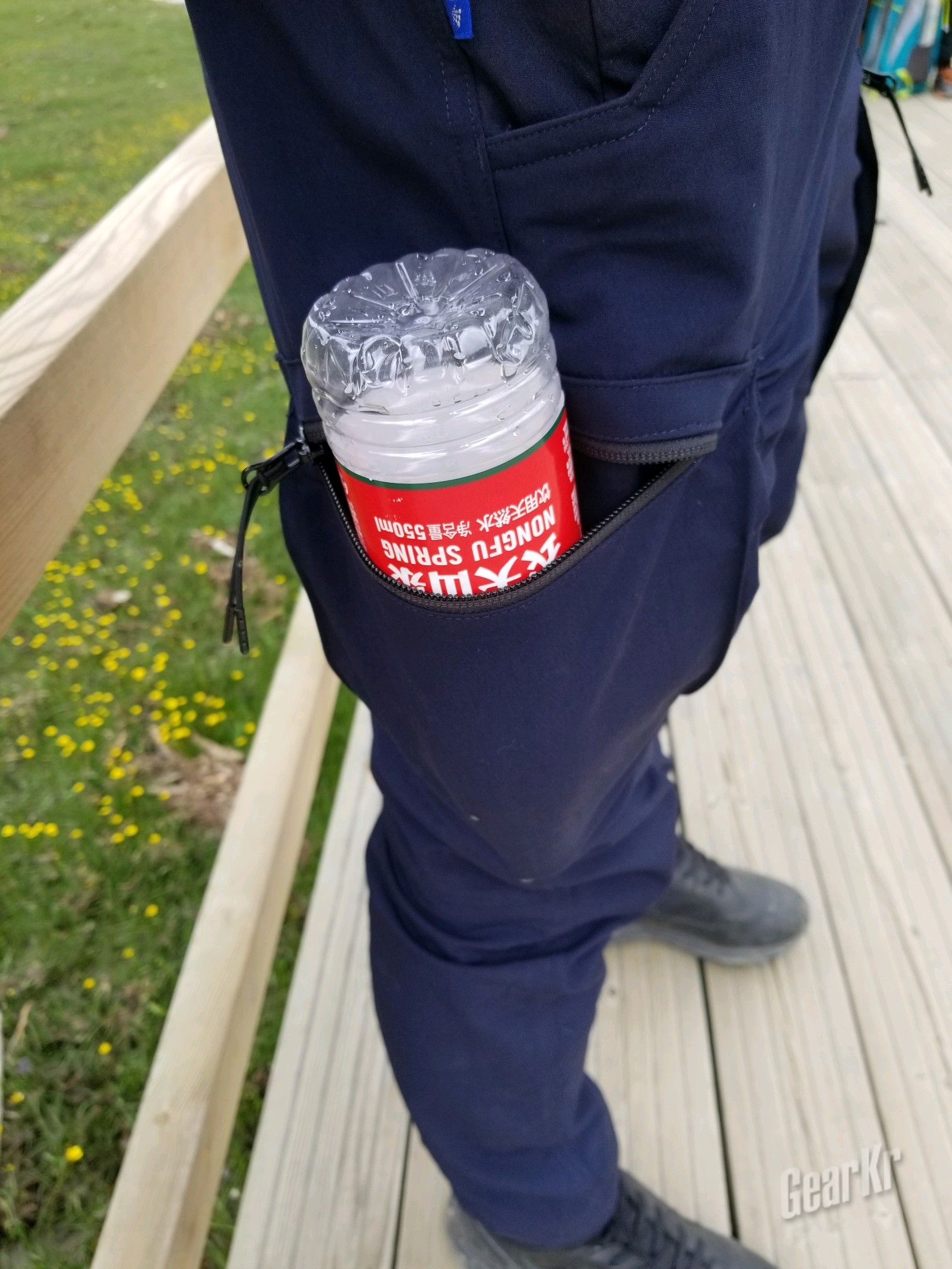 现在只能放放水瓶,手机。这裤子设计不错,首先放手机进去,你跑起来基本不会晃动,很多裤子很晃,它就不是,跟他紧身或者面料有关吧,比较适合携行小物件做动作。水瓶在此,一个放不下,同样它放水瓶也不是很晃。