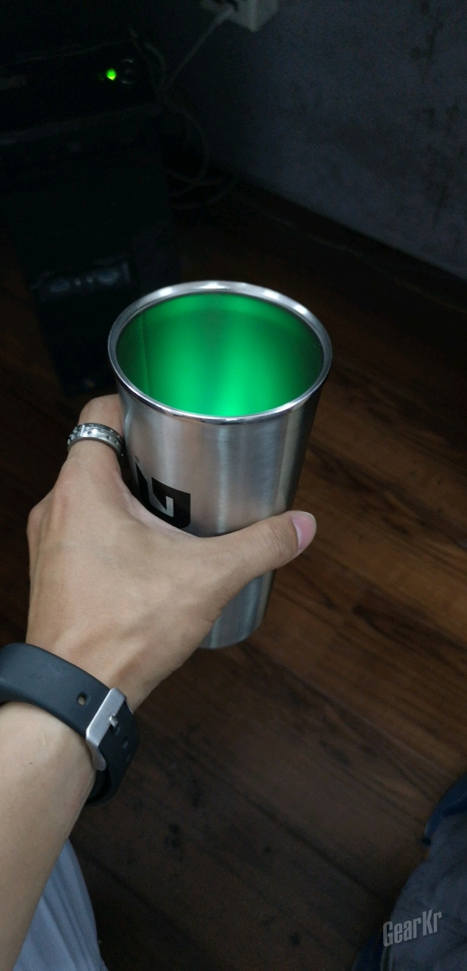 内侧表面呈现雾面的磨砂质感,滚压拼接时的整齐焊缝,整个内部没有砂眼或气孔。内外层相连的杯口处做了外倾的卷边处理并予以抛光,尽可能得使其触感光滑。虽然不如普通玻璃酒杯那样圆润,但外倾的杯口可以很好的避免倾倒杯中残液时,液体顺杯挂漏在外。