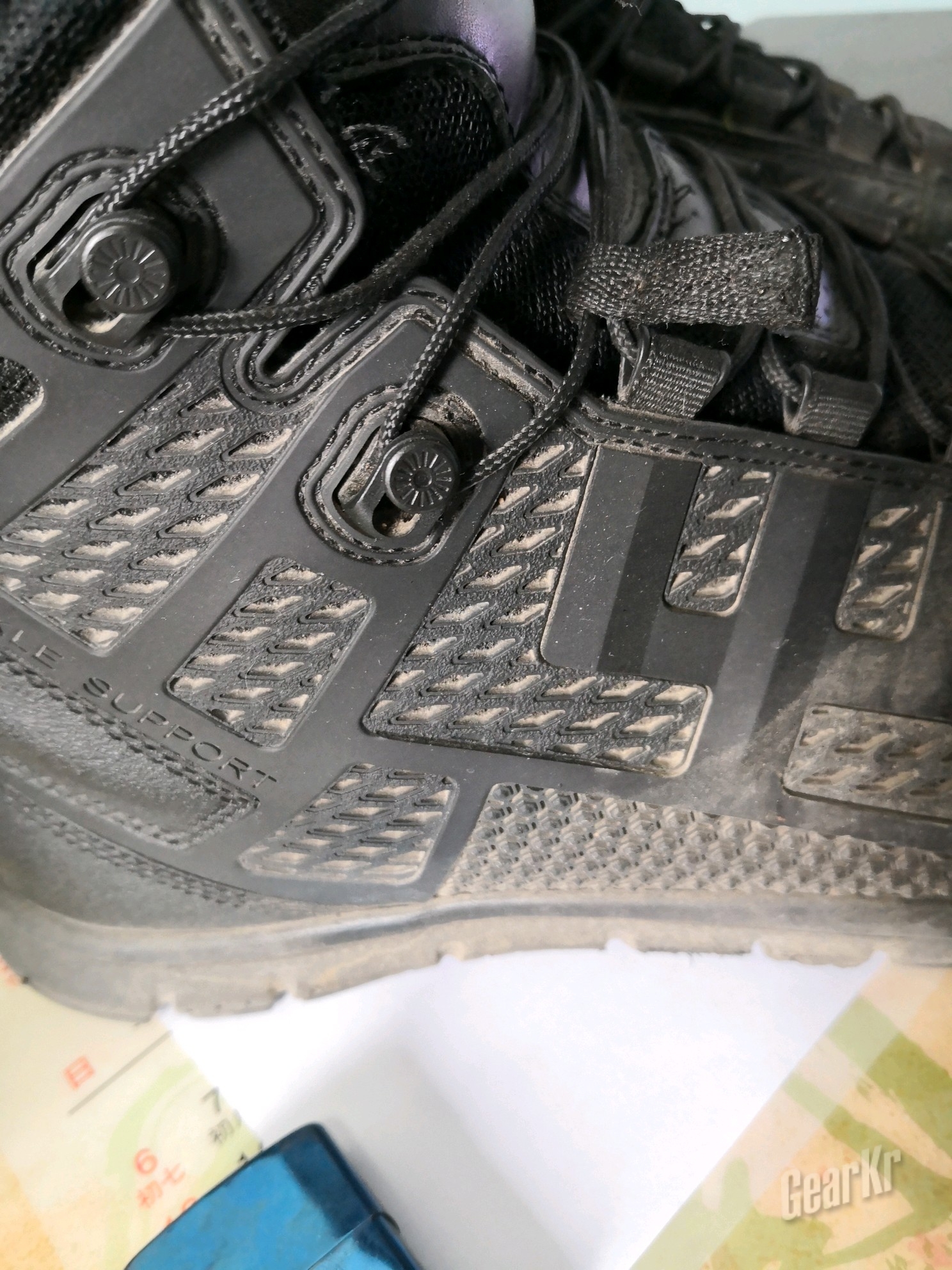 这双轻量化靴子在室外靶场的环境下使用相对较高,其他时间基本就在日常通勤的情况下使用,没有让它出过大力、受过折腾。鞋面浮灰较多,不是本人不爱干净是方便大家发现一个问题。