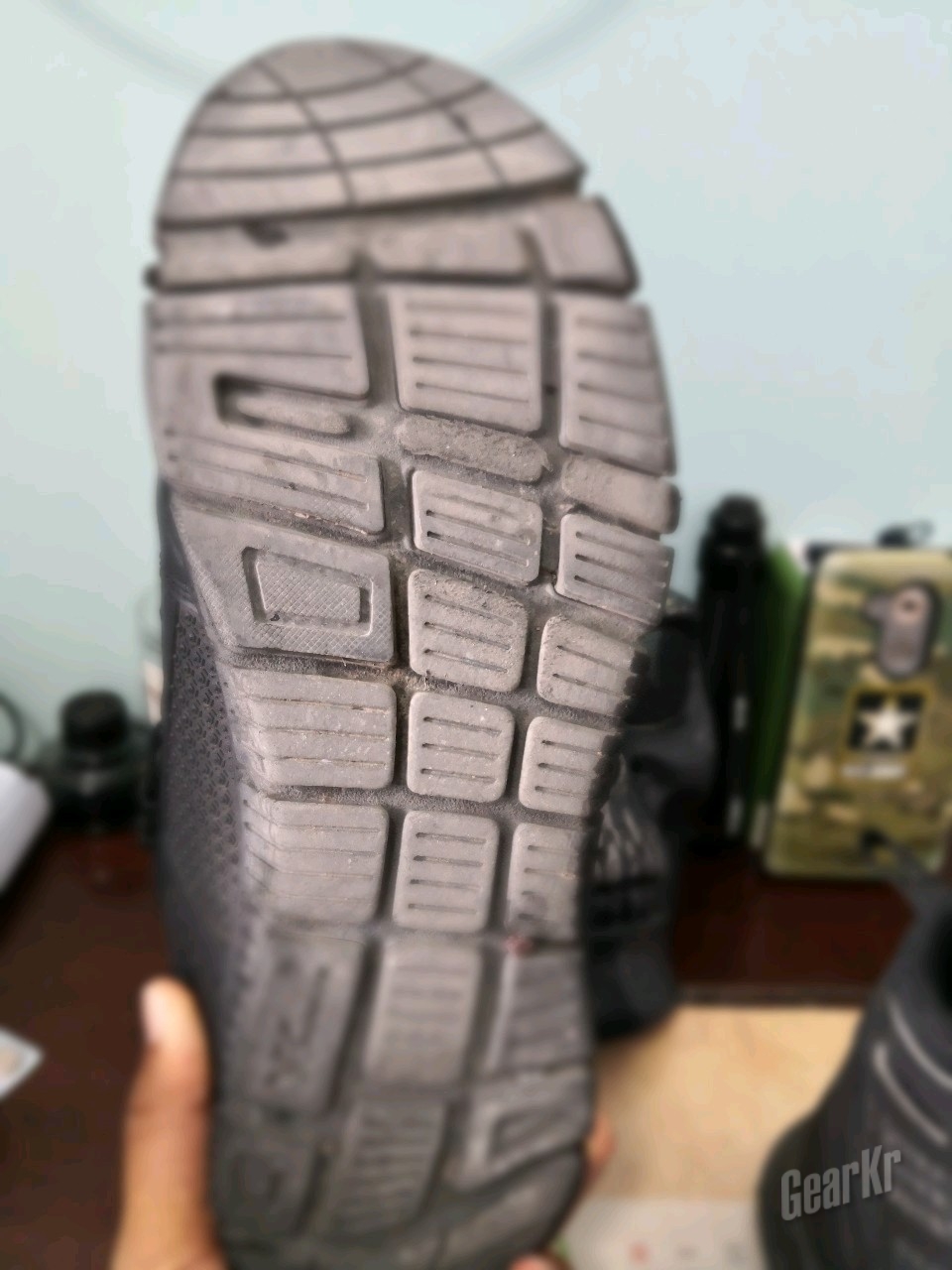 鞋底采用了PSIGEAR专利的双密度结构比传统作战靴更加舒服纹路使鞋有更好的防油防滑性能。但是不能碰见泥地,虽然在城市中很少能碰见,但是在下雨天踩中绿化带,对不起排泥很难,马上会很滑。但是看到评测说有跑鞋的感觉,真扯!整个鞋底太薄,没有前后高度差,中底缓震不足也没有支撑。